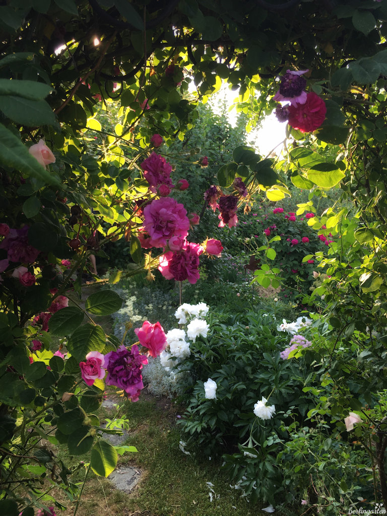 - Rosenbogen mit Rose ‚Himmelsstürmer‘ und Blick auf Pfingstrose ‚Festiva Maxima‘ und Rose ‚Rose de Resht‘