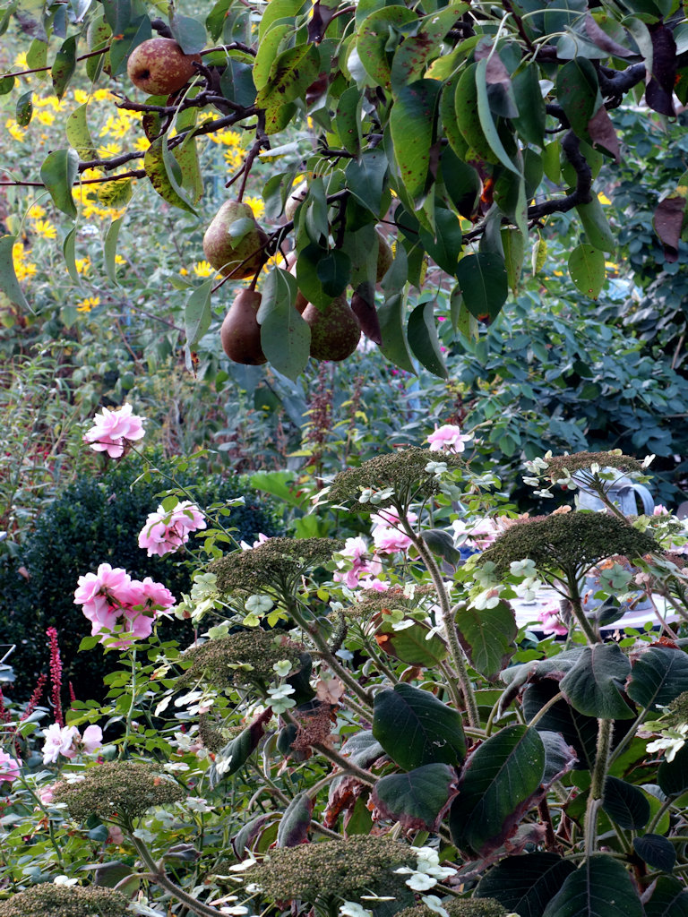 Die Apfel- und Birnbäume haben wir abgeerntet und futtern und saften wie verrückt – immer im Wettlauf mit der Monilia-Fruchtwelke. Wenn ich montags krumm ins Büro komme, wissen meine Leute schon, dass ich wieder durchs Unterholz gekrochen bin, um alle kranken Früchte aufzulesen. Hygiene muss sein.