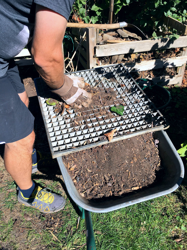 Es grünt wieder in den Beeten und ich mag die auflaufenden Pflänzchen, die sich jetzt überall zwischen den Stauden zeigen, noch nicht mit meinem Obstbaumlaub zudecken. Unsere späten Apfelsorten sind noch nicht geerntet und ich koche fleißig Apfelmus. Bis Samstag konnte ich noch Schlangengurken ernten, aber in der Nacht hat sie der erste Frost geholt. Auch das Kürbislaub ist schwarz geworden. Es wird Zeit, die Blumenkübel ins Winterquartier zu bringen. Jetzt wird es Zeit, den Kompost durchzusieben. Durch die vielen Staudenbeete sammelt sich bei mir der Kompost in 5 großen Mieten an.