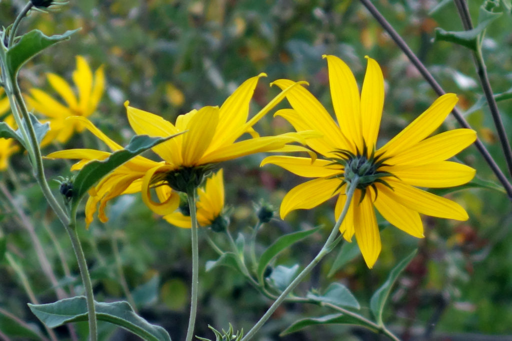Hihi, ob ich Topinambur verfluchen werde muss ich noch abwarten. Im Frühjahr waren ein paar Knollen in unserer Ökokiste, die ich vergessen hatte zu ändern (ich mag keine Topinambur). Da ich ungern Lebensmittel wegwerfe habe ich die Knollen in unserer Gerümpel-Kompostecke zwischen die Heckenrosen in den Hang gebuddelt und abgewartet. Dass sie diese Trockenheit überstanden haben, ausgetrieben sind und jetzt sogar blühen verdient Respekt. Mal sehen wie sie sich entwickeln. Sie können dem noch größeren Chaos/Wildwuchs von der Nachbarsgrenze gut etwas entgegensetzen.