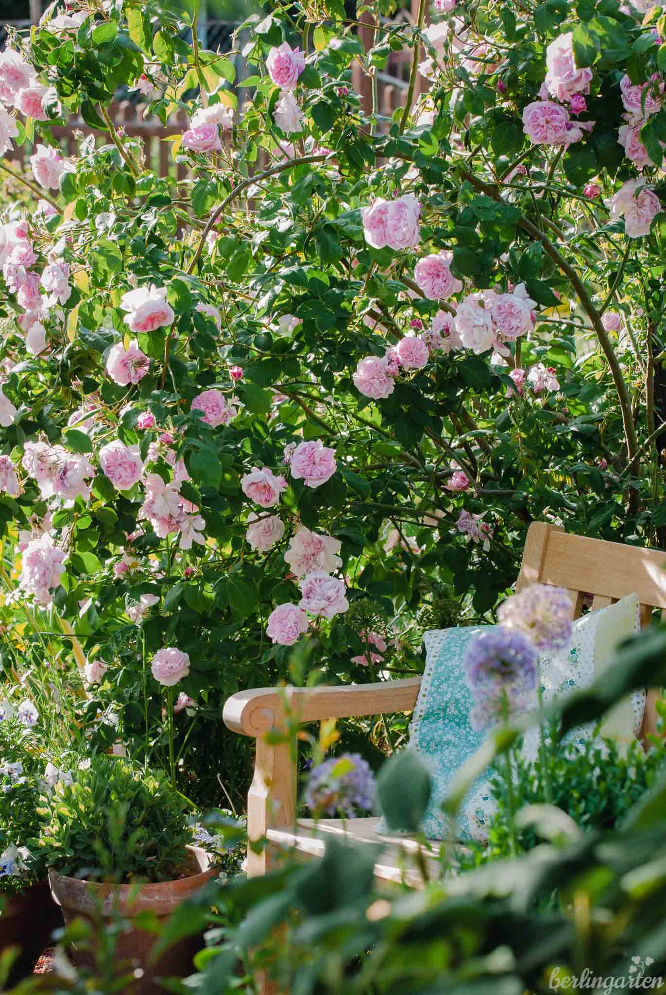 Und so zeigt sich mein Lieblingsplatz zur Rosenblüte. Die Zentifolie ‚Fantin Latour‘ gibt mir das Gefühl, eine Rosenprinzessin zu sein.
