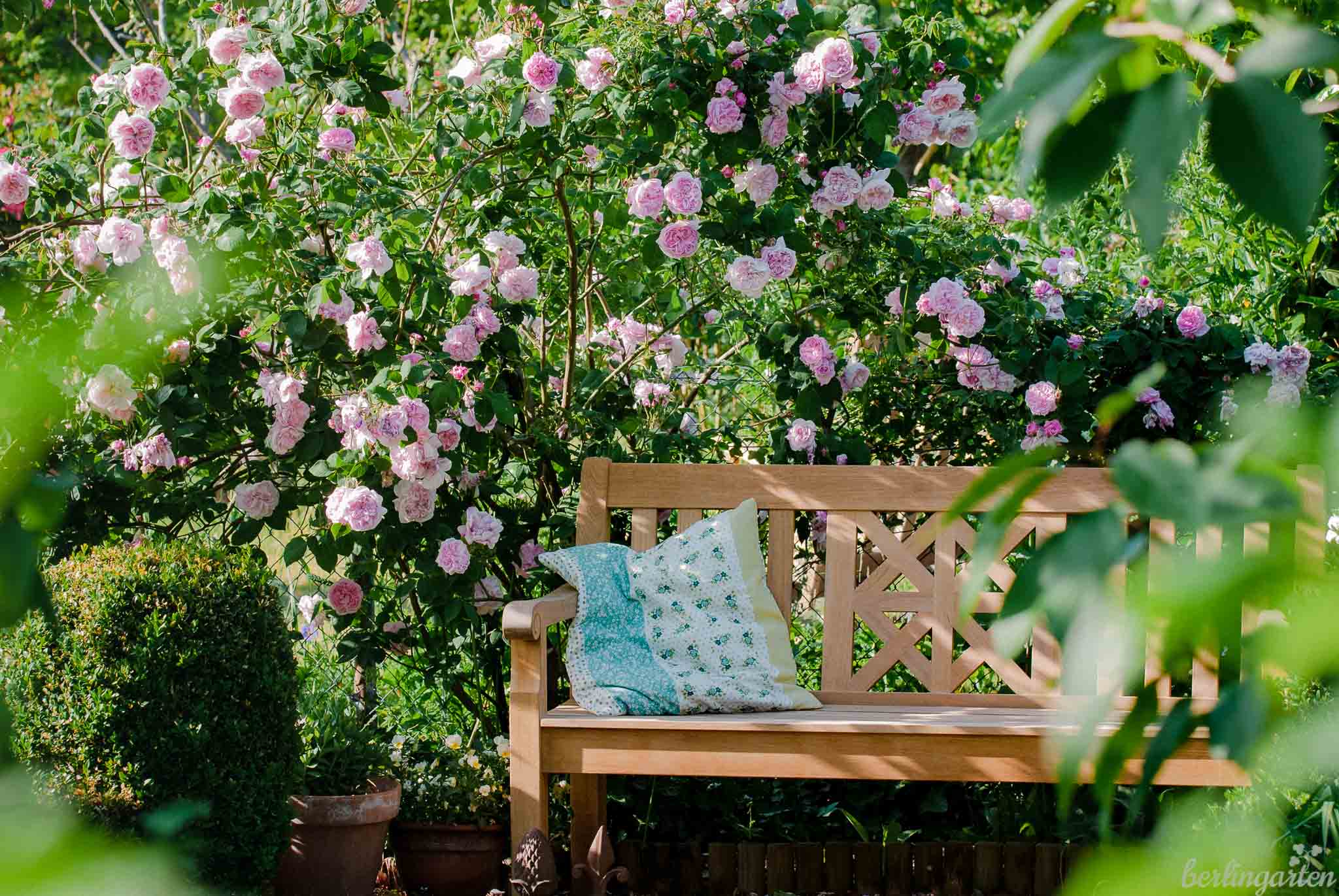Mit einem festen Platz der Entspannung bietet mir der Garten überdies die nötige Erholung. Erst durch die Kombination von Bewegung und Ruhe wird der Garten zum Genuss, das Gärtnern nicht zur ‚Gartenarbeit‘, wie wir Deutschen ja leider oft sagen. Der beste Entschleuniger ist meiner Erfahrung nach eine Bank, mit der ein Garten erst richtig eingerichtet wird. Sie ist optischer Mittelpunkt und ruft immer wieder zum Innehalten: „Mach Pause, schau in den Sonnenuntergang, lies mal wieder und gönn dir ein Kräuterwasser und einen kleinen Blumenstrauß.“ Ich gehorche natürlich und lege schnell einen weißen Schal als frühlingsleichte Tischdecke auf das Holz, pflücke ein paar Blüten und etwas Minze. Ein festes Ritual ist das inzwischen geworden.