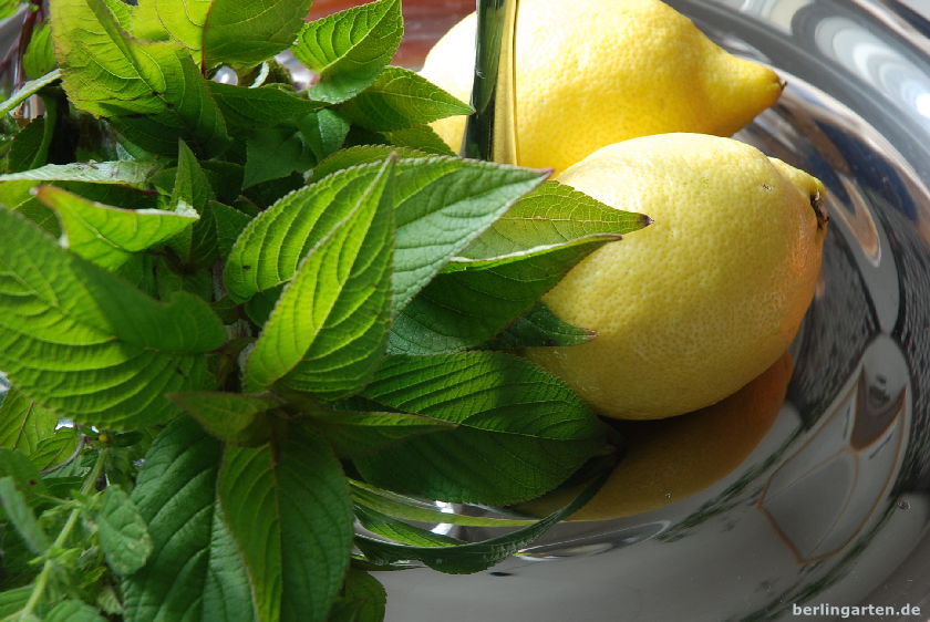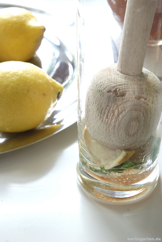 Dann gebe ich braunen Zucker nach Belieben dazu, Zitrone oder Limette in Achteln sowie die ersten Kräuter. Das kann Zitronenmelisse, Minze, Zitronenverbene oder Ananassalbei sein. Gern auch von allem etwas. Dann wird gestampft.
