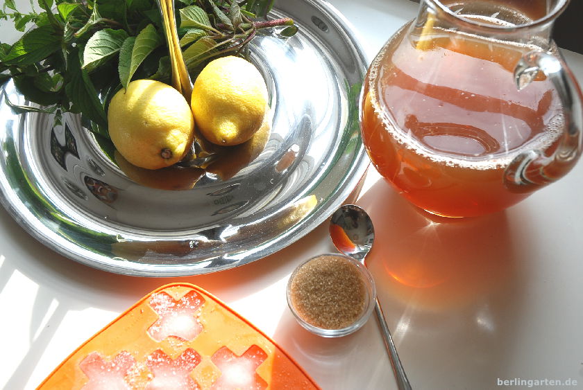 Ein heißer Sommertag und selbst gemachter Eistee gehören für mich unbedingt zusammen. Frische Kräuter aus dem Garten, Zitrone und grüner Tee – viel mehr braucht es nicht für die Erfrischung.