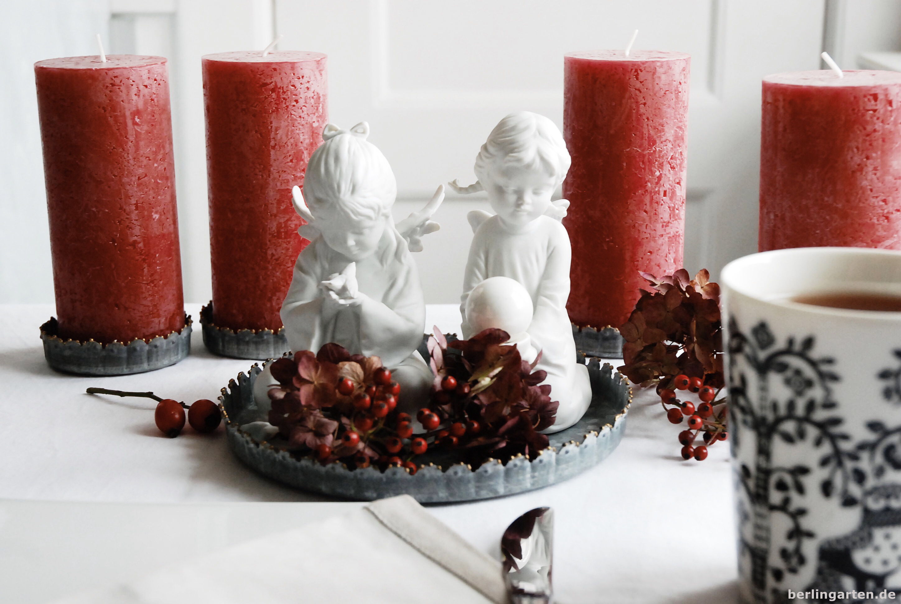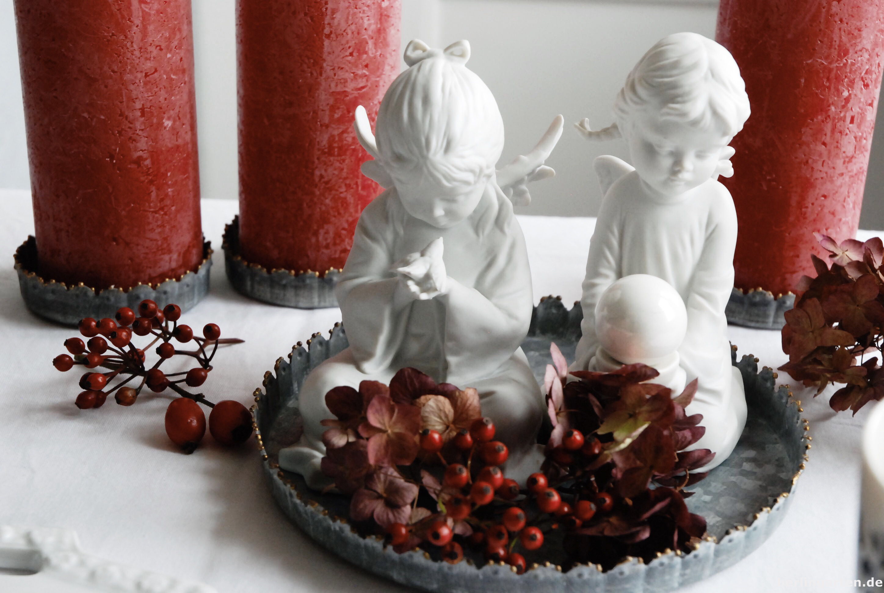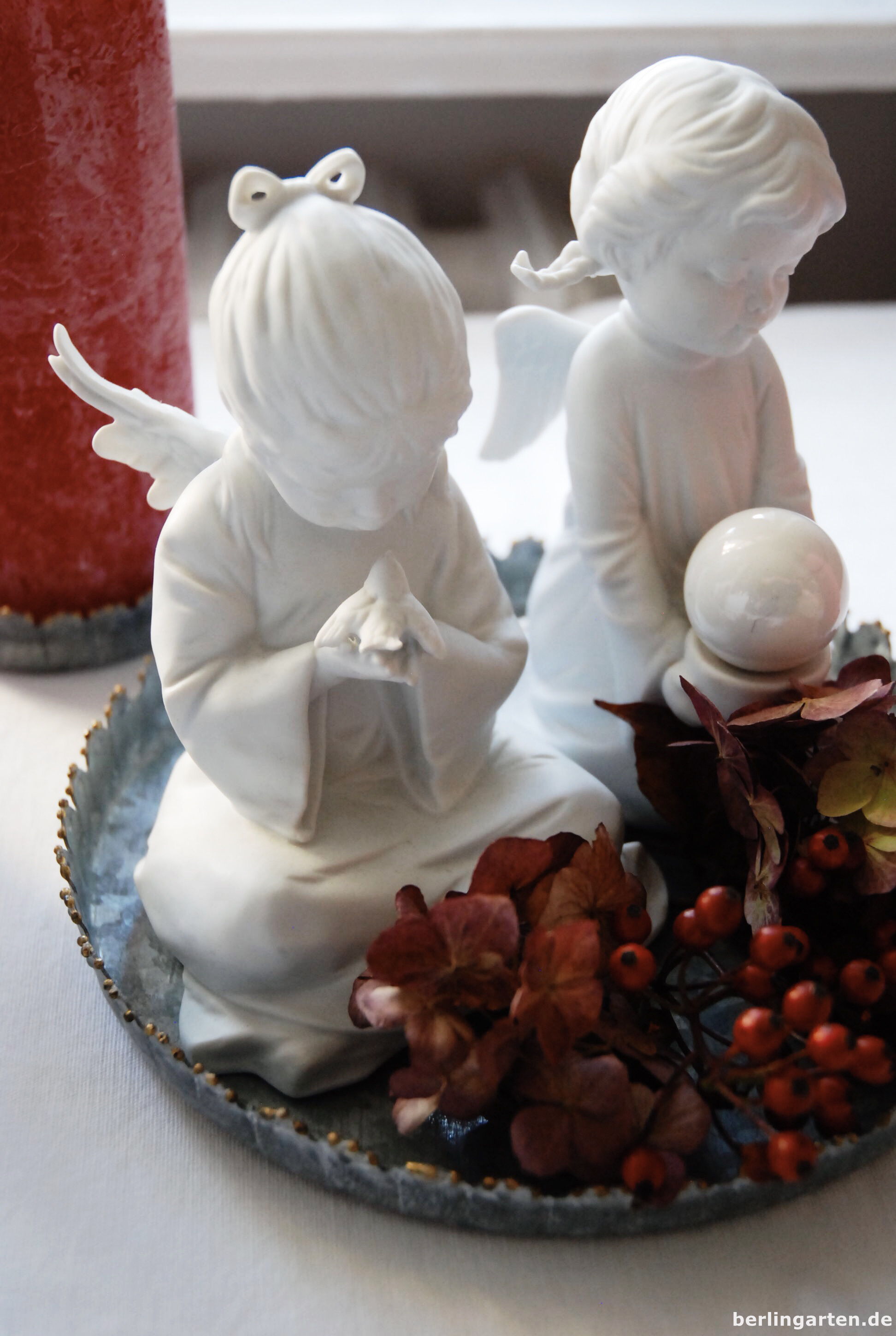 Als Hingucker auf das Tablett kommen bei mir meine beiden Mädchen dazu, kleine Porzellanengelchen, die ich von meiner Großtante geerbt habe und die ich wahnsinnig liebe. Sie sind von Kaiser, nicht mehr im Programm, aber bei ebay gibt’s ja alles. Bestimmt hast du aber ähnliche im Fundus, die endlich raus an die frische Adventsluft wollen. Wobei: Kugeln sind auch nicht schlecht. Oder Glocken. Oder einfach noch mehr Gartenzeug. Oder eine kleine vorgetriebene Christrose im Topf. Auf geht’s!