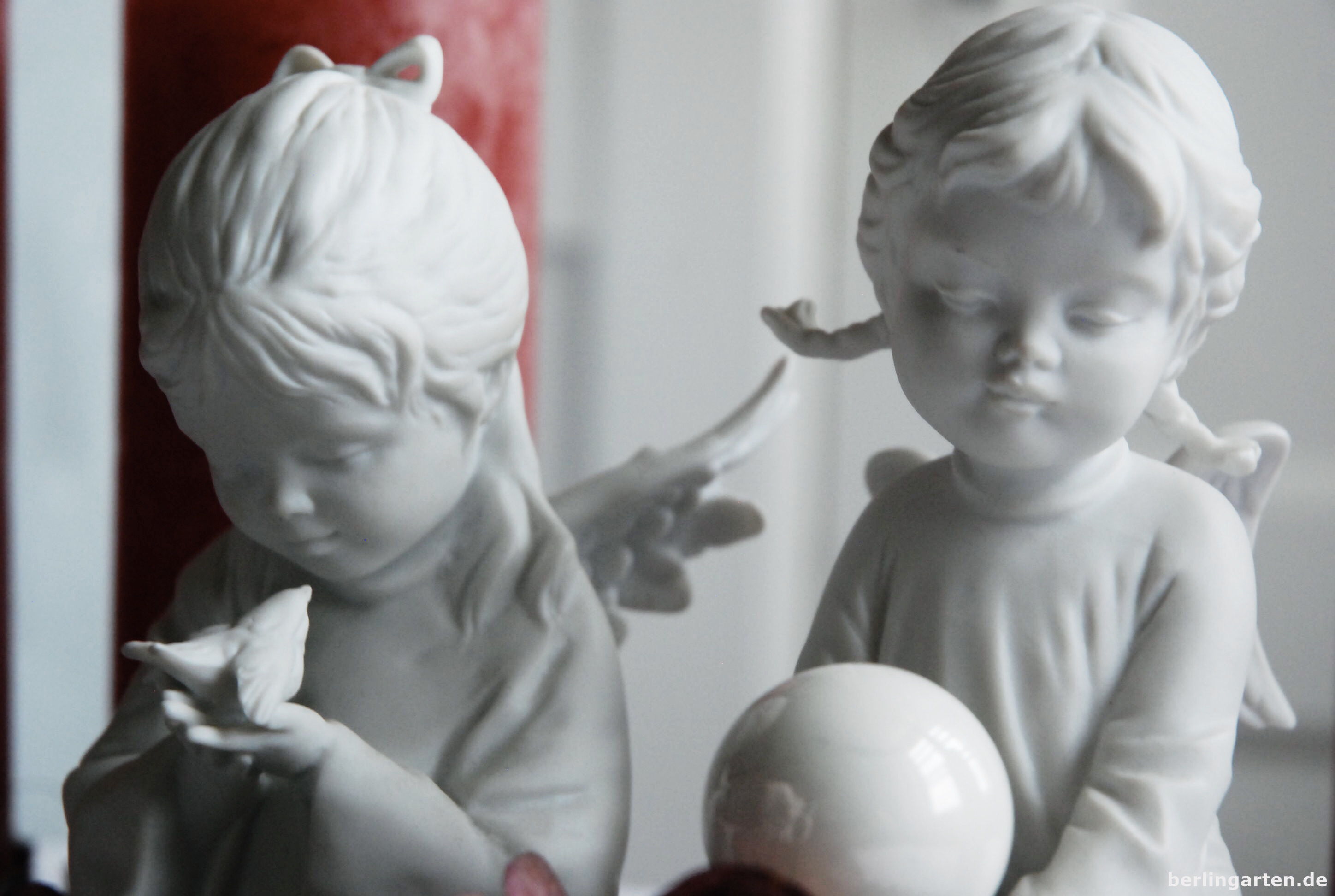 Das Arrangement ist ganz zauberhaft. Die Engel sind so schön gearbeitet, wie es bei aktuell angebotenen Stücken kaum mehr der Fall ist. Und im Kontrast zu weiß und schiefergrau leuchtet das warme Rot doppelt intensiv!