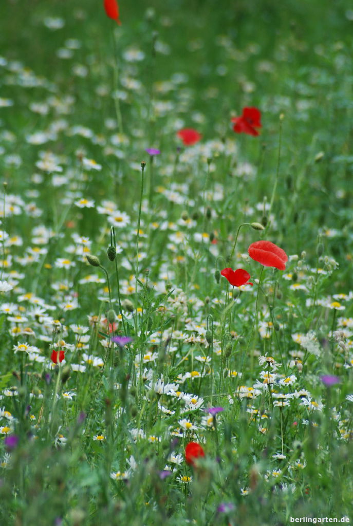 Alles ist relativ. Das merke ich auch jetzt, wenn ich Ausschau nach roten Flecken halte. Ich lebe in Berlin. Einer Stadt, die im internationalen Vergleich zwar grün, aber gerade dabei ist, ihre letzten Fleckchen Natürlichkeit zu verramschen. Entsprechend lange radle ich, bis ich die ersten Mohnblüten ausmache. Und ich finde sie auch nicht wild, sondern in einem ungestylten Vorgarten. Die Margeriten, die ich euch zeige, wachsen im berlingarten, die Königskerzen in einem Nachbargarten in der Kolonie Oeynhausen. Die Storchschnäbel Geranium pratense gedeihen auf der Cornelsenwiese in Berlin-Wilmersdorf, einer der letzten Wiesen, die ich in meinem Umfeld kenne. Und prompt hat sie den begehrlichen Blick der Immobilienwirtschaft auf sich gezogen. Eine Bürgerinitiative kämpft.