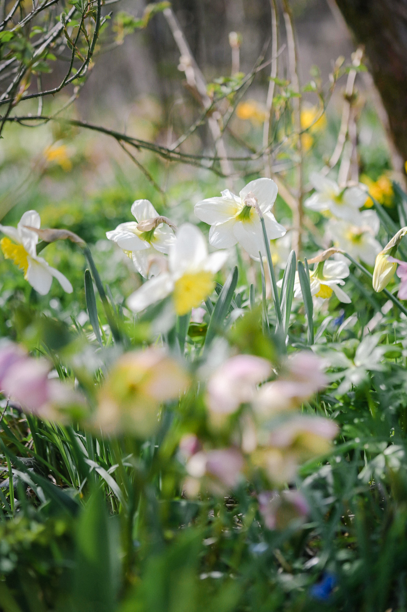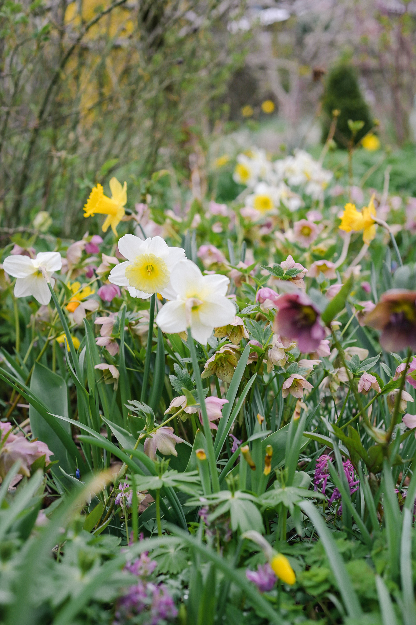 Anfangs habe ich viele Sorten ausprobiert, und ganz großblütige, grobe auch wieder aussortiert, da zu dominant. Jetzt hat sich durch die Wiederkommer ein Sammmelsurium gebildet mit vielen Überraschungen in jedem Frühjahr.