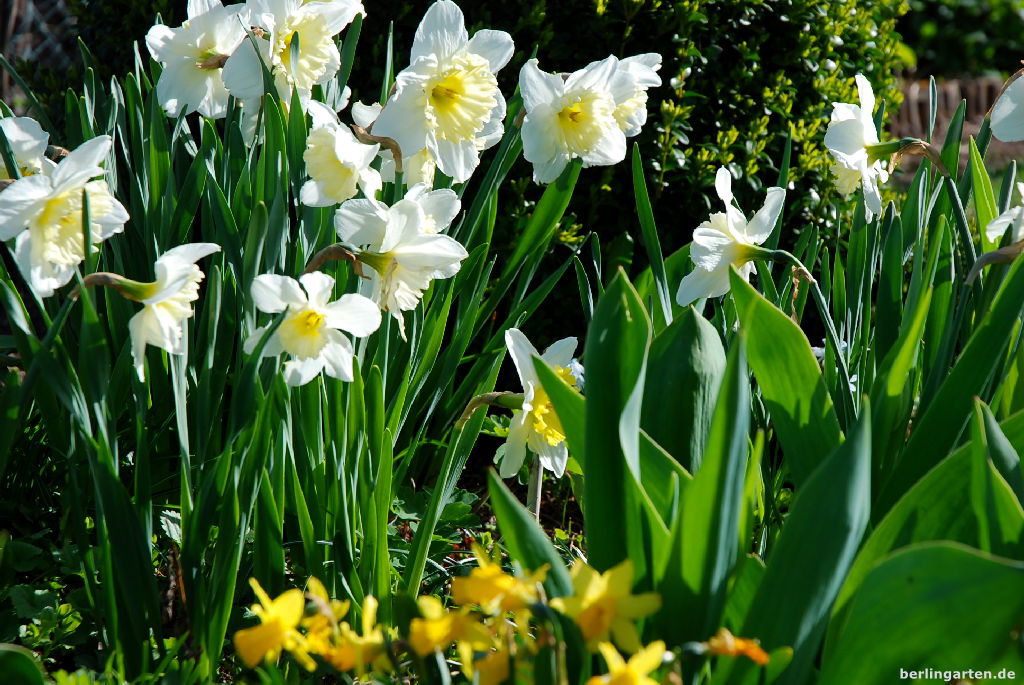 Ende März/Anfang April erstrahlt berlingarten in cremeweiß mit hellgelb: Ice Follies dominiert die Beete. Sie gefällt mir so gut, dass ich sie überall und in großer Stückzahl integriert habe. Wo immer noch Blühlöcher sind, mache ich Fotos, archiviere diese im Handy und trage mir einen Termin für Mitte September ein, damit ich das Nachpflanzen nicht vergesse.