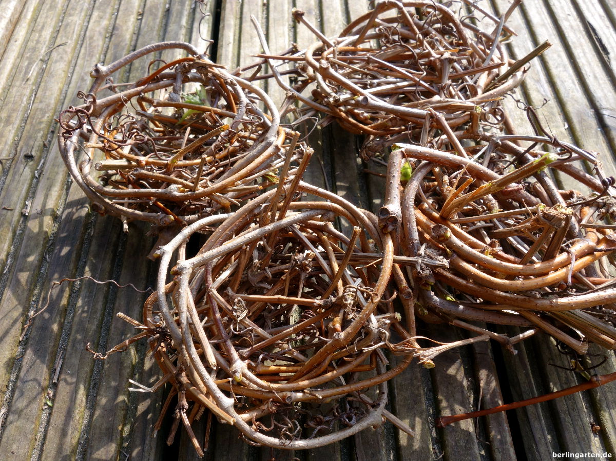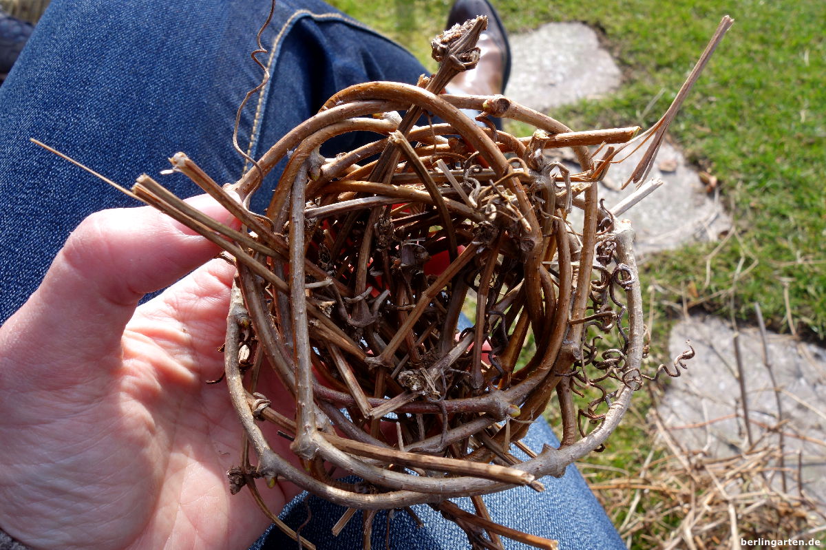Ich fasse Clematisschnitt zusammen, der ziemlich brüchig ist (du bekämest ihn geschmeidiger durch ein längeres Wasser-Tauchbad). Darum herum schlinge ich die elastischeren Ranken des wilden Weins. In der Mitte des Nestbodens sollte es locker-löchrig bleiben, damit hier später die Hyazinthenwurzeln gut durchpassen.
