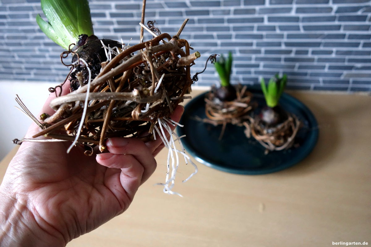 Die Hyazinthen – oder alternative Zwiebelblüher nach Gusto – befreie ich durch Abspülen vorsichtig von ihrer Erde und drücke sie sanft durch den Nestboden. Es werden einige Wurzeln abbrechen, aber das hindert die Pflanze nicht daran, ihre Blüten zu schieben, als wenn nichts wär. Die Zwiebeln sitzen am Schluss sicher auf den Nestern wie das Frühstücksei in seinem Becher. Oder eben das Vögelchen auf seiner Brut.