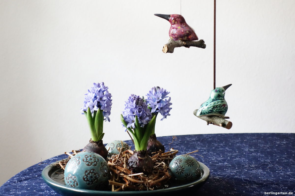 Von den vier vorbereiteten Nestern passen drei auf meinen Keramikteller, der gerade so viel Wasser aufnimmt, dass die Wurzeln nass, die Zwiebeln aber trocken sind. Zum Blütenblau der Hyazinthen und dem Dunkelgrün des Tellers harmonieren meine Keramikkugeln sehr schön. Den kessen Piepmätzen aus Ton gefällt’s. Ich sag ja: Gar nicht schlecht für den ersten Nestbau.