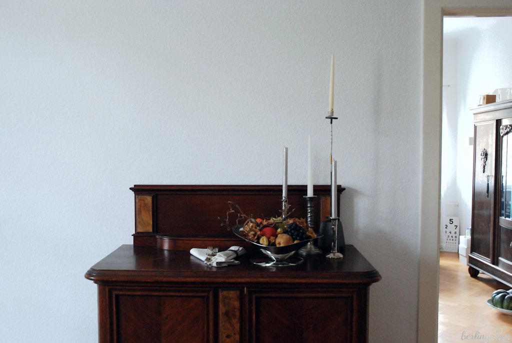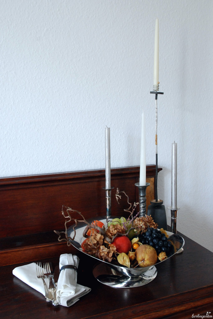 Viel Text braucht dieser Blogpost daher nicht. Ich möchte nur zeigen, dass man aus dem Alltäglichen auch etwas Besonderes machen kann. Unser Obst lege ich zum Beispiel nicht einfach so in eine Schüssel. Ich nehme jetzt im Herbst ein paar trockene Zweige und Blüten dazu und habe in Kombination mit unseren Vintage-Möbeln und einer extravaganten Schale ein Arrangement wie die Stillleben der Alten Meister. Sehen die Trauben, die Birne und der Apfel nicht wie Kunstwerke aus? Ich kann verstehen, warum im Barock das Genre, Obst, Silber, Leuchter und ähnliches zu malen, so populär wurde.