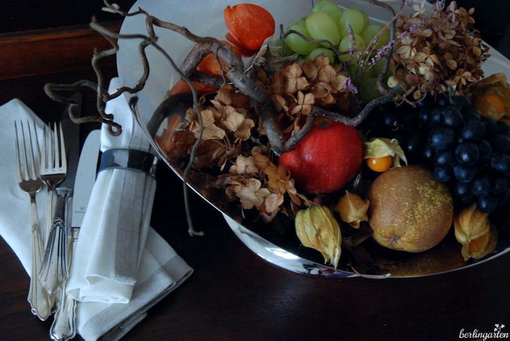 - Obst wie bei den Alten Meistern: einfach mit Zweigen und getrockneten Blüten vereinen