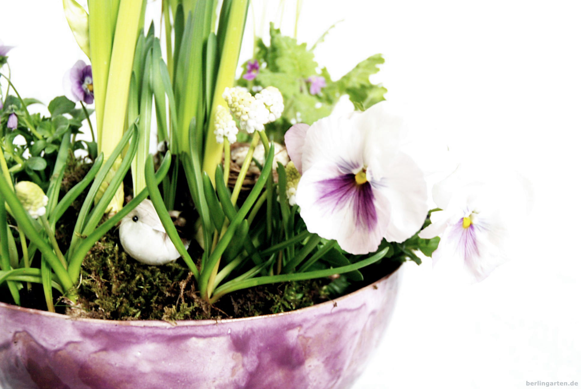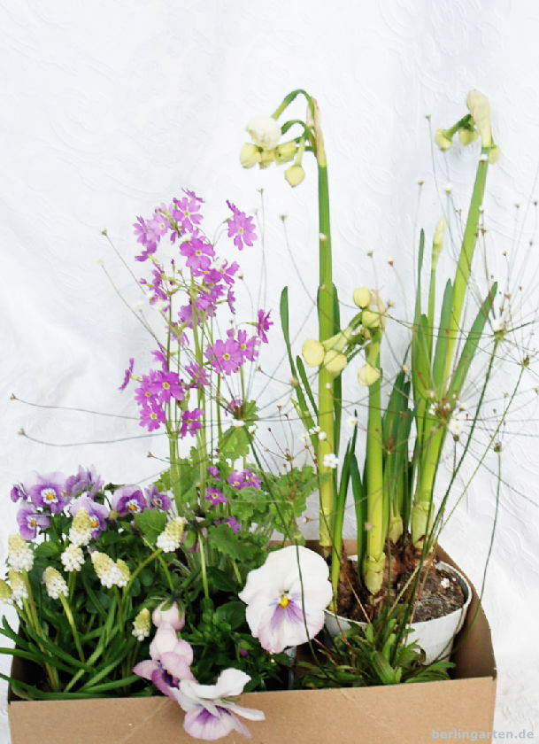 Entschieden habe ich mich für eine lila-pastellige Kombination aus Narzisse Bridal Crown (eine Tazette mit herrlichem Duft), Hornveilchen, Stiefmütterchen, weiße Traubenhyazinthe, Primel Primula cortusoides sowie Nördliches Mannsschild Androsace septentrionalis aus der Familie der Primelgewächse. Von dieser Pflanze habe ich noch nie zuvor gehört und finde sie einfach bezaubernd. Sie bringt mit ihren filigranen Blütenständen genau die richtige Prise Bewegung in die Zusammenstellung.