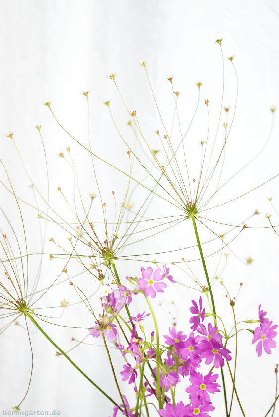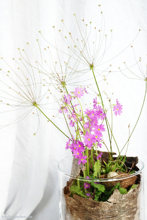 Übrigens fand ich das Nördliche Mannsschild und die Primel so ausdrucksstark, dass ich sie gern nur zu zweit arrangieren wollte. Also habe ich mir noch jeweils eine weitere zugelegt. Nun kommt wieder die große Glasvase zum Einsatz. Birkenrinde sorgt dafür, dass die Töpfe verdeckt sind und nichts die Aufmerksamkeit von den tänzelnden Blütenstielen ablenkt.
