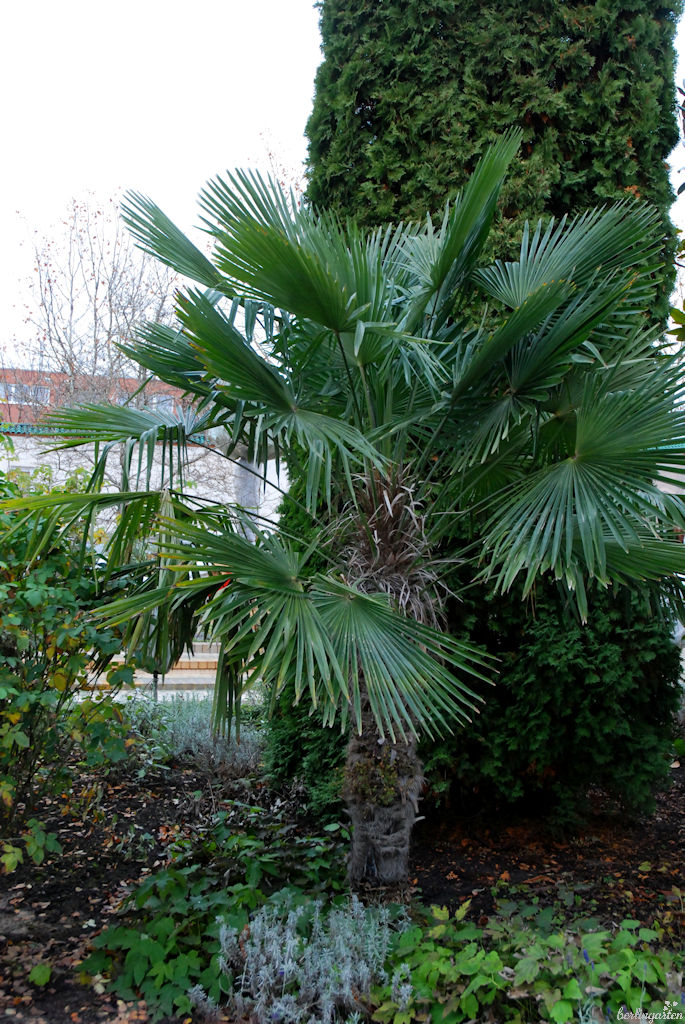Es handelt sich im Orientalischen Garten um Exemplare der Chinesischen Hanfpalme Trachycarpus fortunei, die die robusteste für unsere Breiten ist und mit 15 cm jährlichem Zuwachs auch wüchsig. Mit dem richtigen Trick schafft es diese Art, auch unsere Temperaturen auszuhalten und im Garten draußen zu überwintern.