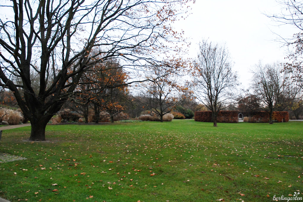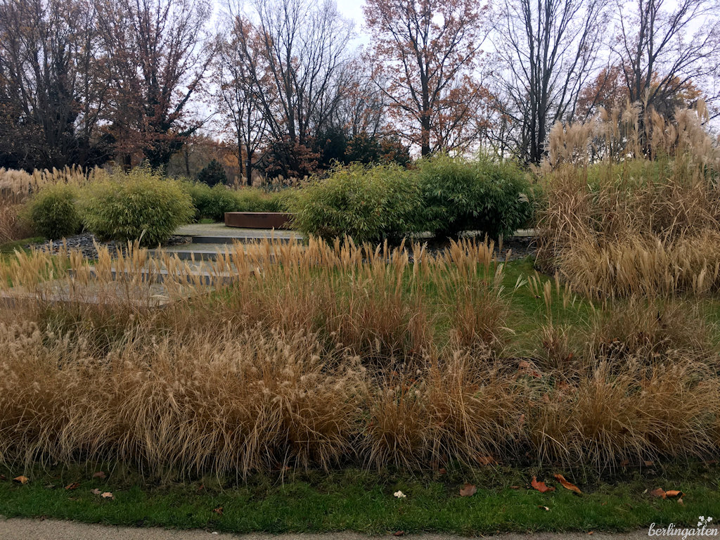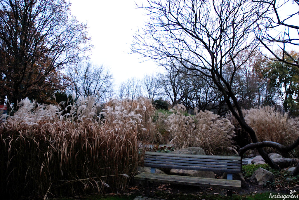 Natürlich belasse ich es bei meinem Besuch nicht bei einer kurzen Stippvisite nur in der „Alhambra Berlins“. Zu schön ist auch jetzt noch der Park mit Gräsern, Bambus, skulpturalen Stauden, Heckenarchitektur. Und da? Dort blüht doch tatsächlich schon ein Rhododendron. Welch Wohltat fürs Auge.