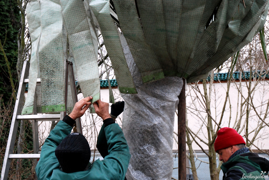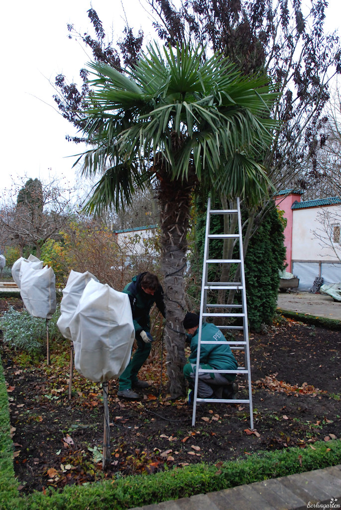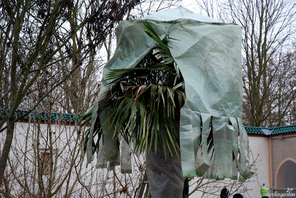 Für die Krone verfügen die Gärten der Welt über speziell angefertigte zeltähnliche Hauben, wenn sie die aber nicht noch aus der Vergangenheit hätten, würden die Gärtner schlichtes Flies verwenden, wie sie auch für die Hochstammrosen zum Einsatz kommen. Zuletzt wird der Boden abgedeckt. Gießen ist normalerweise nicht nötig, außer es gibt lange Trockenheitsperioden und der Boden ist nicht gefroren. Fällt viel Schnee, muss der von der Krone heruntergeschüttelt werden, um einen Palmenbruch zu vermeiden.