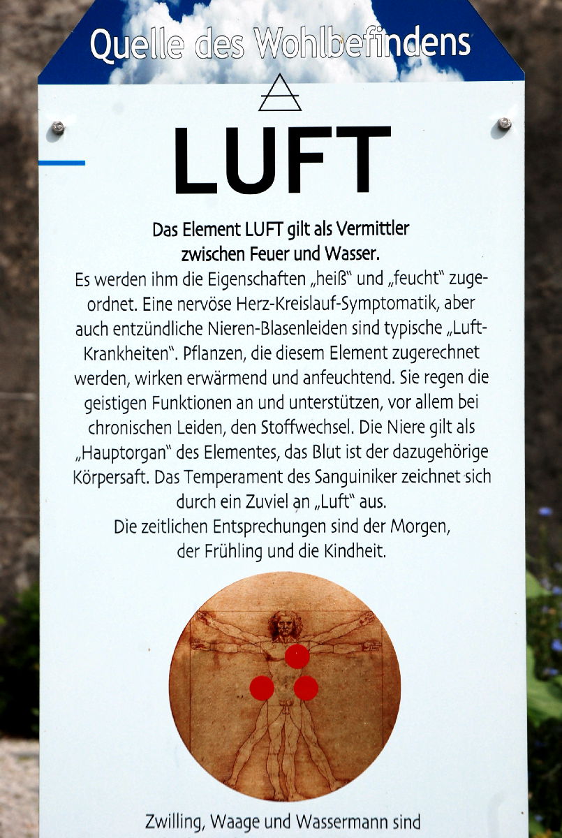 Man orientierte sich an den vier Elementen Luft, Feuer, Wasser, Erde wie schon Hippokrates die vier Temperamente Choleriker, Melancholiker, Phlegmatiker und Sanguiniker beschrieb. Qualitäten werden zugeordnet: Farben, Elemente, feucht/trocken, heiß/kalt. Mit solcher Einordnung versuchte man, die Gründe für gesundheitliche Probleme herauszufinden und ursächlich zu lösen. Es galt, das fehlende Element zu füllen und das überschüssige abzuleiten.