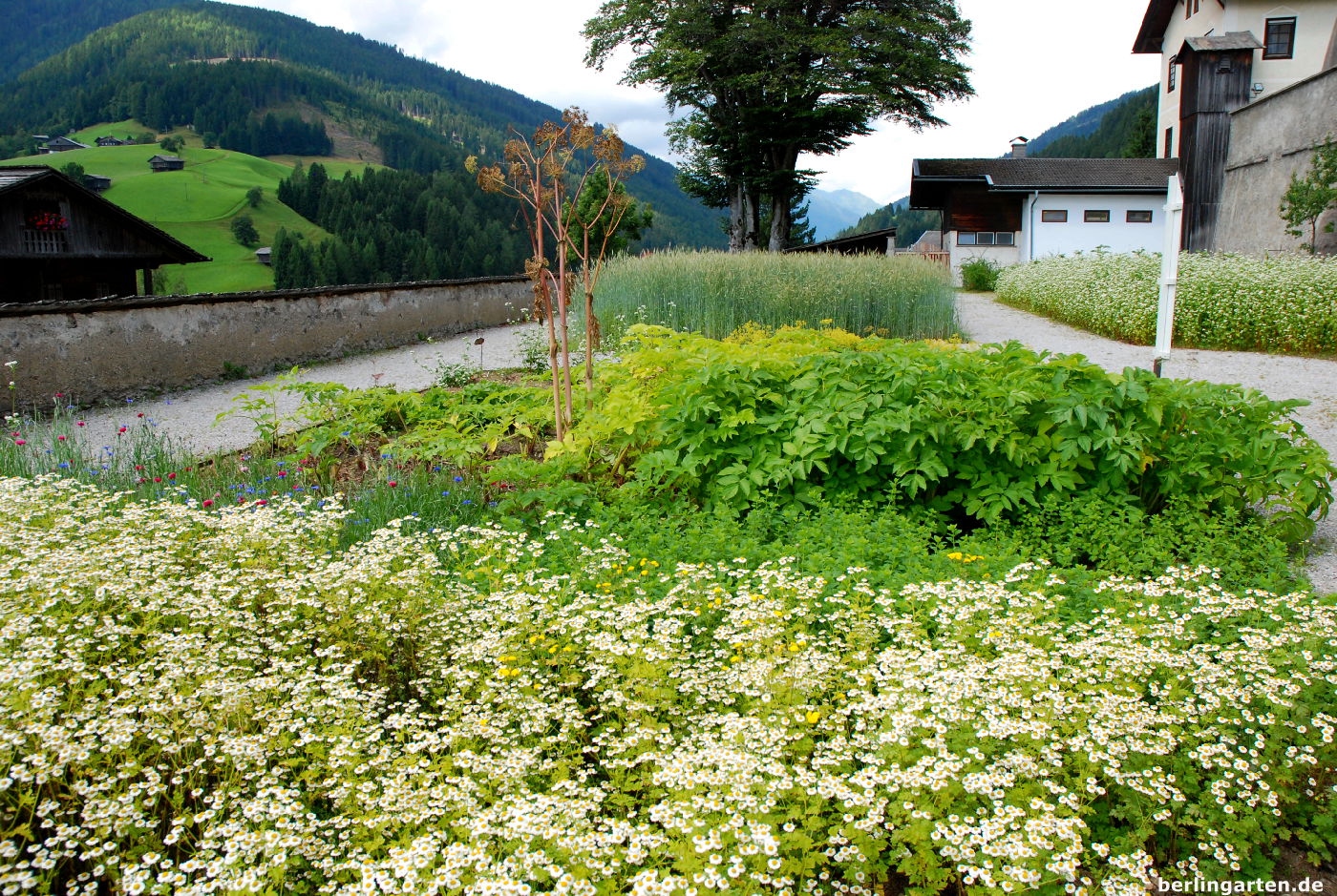 Der Klostergarten Maria Luggau (hier im Juni) befindet sich auf einer Terrasse unterhalb des mächtigen Serviten-Klosters