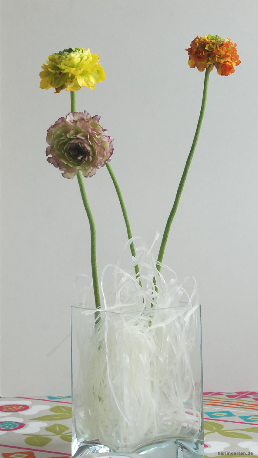 Also musste eine individuelle Lösung für meine drei wunderschönen, gefüllten Ranunkeln her. Statt im Wok sind meine Vorräte an chinesischen Glasnudeln in einer rechteckigen Glasvase gelandet. In ihnen kann ich die Glasröhrchen fürs Blumenwasser gut verstecken und die Lebensmittel nach ein paar Tagen dann doch noch verbraten. Klar, das mach ich, die stauben auch nicht mehr ein, als die Äpfel in der Obstschale.