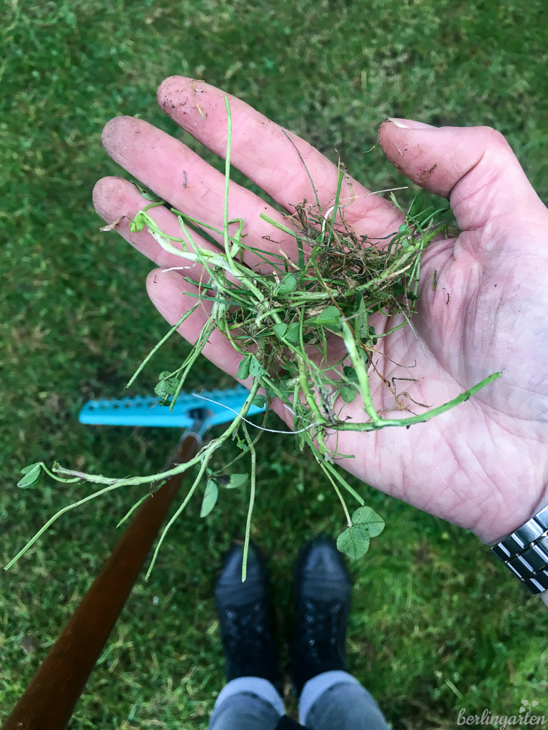- Klee-Stängel lassen sich nach dem Vertikutieren ganz leicht herausziehen