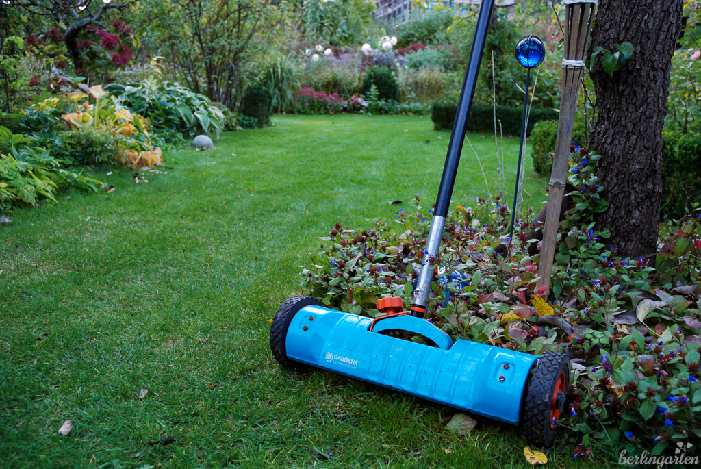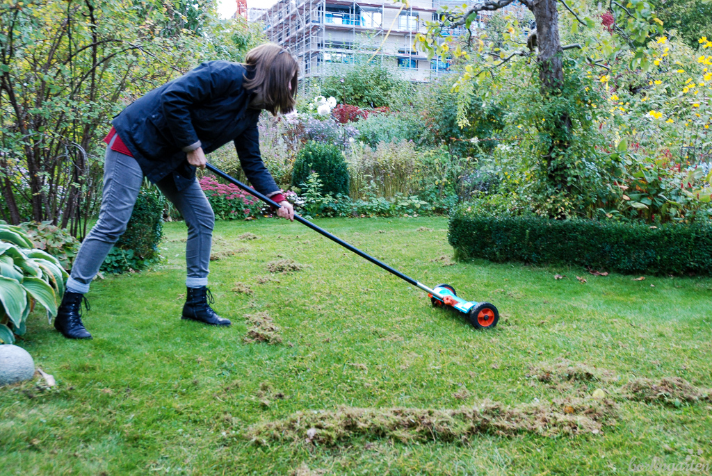 wahrscheinlich sind alle mit ihren herbstlichen Gartenaktivitäten beschäftigt?! War ich heute auch, und genau wie du mag ich die herbstliche Rasenpflege! Setze sogar – wenn Zeit ist – noch einen drauf: jetzt, wo sich das Wachstum der Gräser entschleunigt hat, mähe ich besonders gern mit dem guten alten Spindelmäher. Im Sommer assistiert uns seit einigen Jahren nach allerhand zähen Mäh-Verhandlungen endlich ein Mähroboter, sehr praktisch. Aber auch etwas chaotisch. Denn er zieht ungerührt seine nicht immer eleganten Zufallsbahnen und ist den Herausforderungen meiner romantisch überhängenden Stauden und Zweige nicht immer gewachsen- außerdem ist da noch ein kleiner Hang, und so sammele ich den Unermüdlichen dann immer wieder mal dort ein wo er kapituliert hat- manchmal auch mit einer Staudenstütze zwischen den gras- und erdverschmierten Rädchen. Wie auch immer- das Schönste für mich ist an einem freundlichen Tag den leise ratternden Spindelmäher mit Fangkorb in ordentlichen Bahnen über das weiche grüne Gras zu schieben, vorbei an Eisenhut, letzten Rosen und Anemonen, oft über die immer häufigeren gelben oder rotbraunen Blätter, die er gerne dann auch schreddert. Es macht Spaß den feinen Schnitt zu beobachten wie er im Bogen von den Klingen in den Fangkorb fliegt und sich dort dann ein schönes Gemisch bildet, das ich später dünn unter Sträuchern und Hecken verteile. Die von dir beschriebenen Maßnahmen führe ich auch durch und kann bestätigen: es lohnt sich. Unser Rasen hat sich jedenfalls gut dadurch entwickelt. Dünger bekommt er aber öfter, teils organisch, denn Boden und Standort sind etwas schwierig. Und wenn ich Zeit (und Lust) habe mische ich ihm ein Müsli aus gesiebtem Kompost, Sand und Urgesteinsmehl, manchmal auch Kalk.