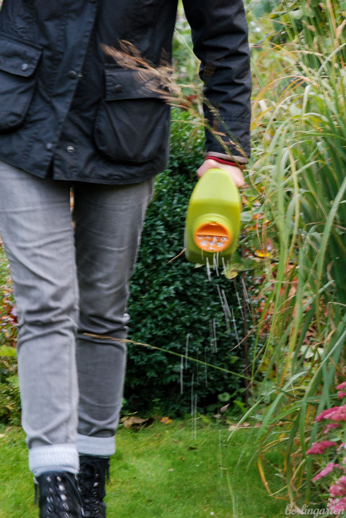 Ich habe dieses Jahr den Herbstdünger schon früher als sonst ausgebracht. Durch den vielen Regen ist er jetzt richtig schön satt grün. Ich werde das in Zukunft immer früher erledigen. Das Vertikutieren spare ich mir meistens. Ich finde, das muss gar nicht sein. Hauptsache, die Gräser sind gut mit Nährstoffen versorgt.