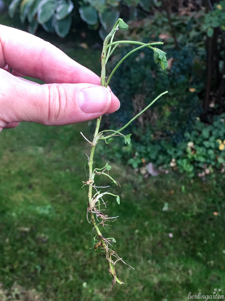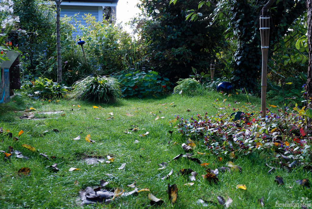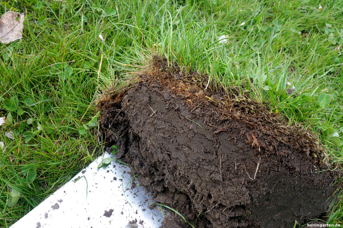 Der Sommer war warm und überaus trocken in Berlin. Als Effekt ergab sich, dass der Rasen wenig bis gar nicht gewachsen ist. Mit den seltenen Wassergaben konnte er auch kaum Nährstoffe aufnehmen. Gefreut hat’s den Klee: Deutlich vitaler als die Gräser, avancierte er von einem kleinen Beikraut zum Hauptakteur. Nicht, dass ich per se etwas gegen Klee hätte – seine Blüten waren den Hummeln reiche Nahrungsquelle. Ihn aber in die Schranken zu weisen und die Gräser aufatmen zu lassen, fand ich jetzt angemessen.