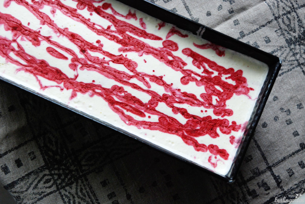 Nun werden die Massen in der Backform verteilt: erst eine Schicht Vanilleeis, dann Fruchtmark, dann Vanilleeis. Ich hatte nur zwei Schichten eingefüllt, drei sind aber sicher besser. Wer mag, kann zum Schluss noch rote Linien aus übriggebliebener Himbeersauce als Dekoration auf die weiße Masse tröpfeln.