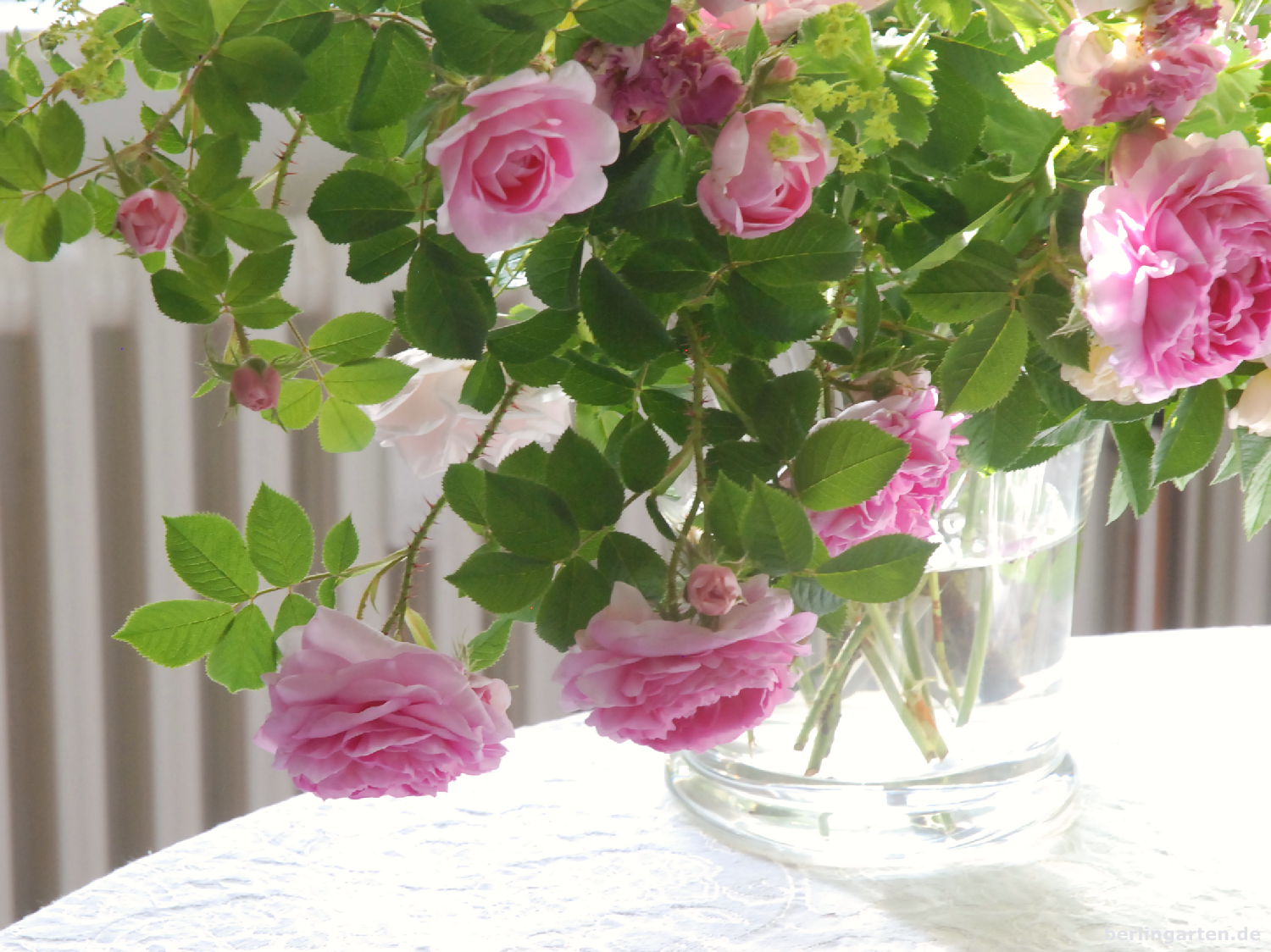 Nein, liebe Xenia, solch ein Prachtexemplar von Rosenstrauß (noch dazu mit historischen Rosen und so gesundem Blattwerk) kann man wirklich nicht kaufen. Ich finde, Du hast nicht nur ein Rosenbeet in die Vase gebracht, sondern Dir die ganze Herrlichkeit des Sommers ins Haus geholt, den Strauß raffiniert mit dem Vasentrick, den ich mir für meine Hortensien merken werde, arrangiert und toll in Szene gesetzt. Und wie schön, dass, wenn der Strauß längst verblüht ist, diese wunderbaren Fotos bleiben.