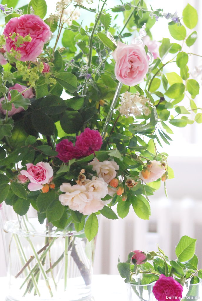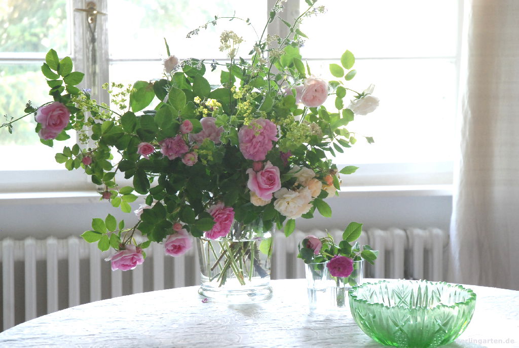 Ein toller Blumenstrauß! Wir haben ja auch wahnsinnig viele Rosen, aber ich kann mich neben dem Abschneiden des Verblühten und dem, was wirklich absolut im Weg hängt, nur schwer überwinden, Blüten für Sträuße abzuschneiden. Ich finde sie sooo schön im Garten.
