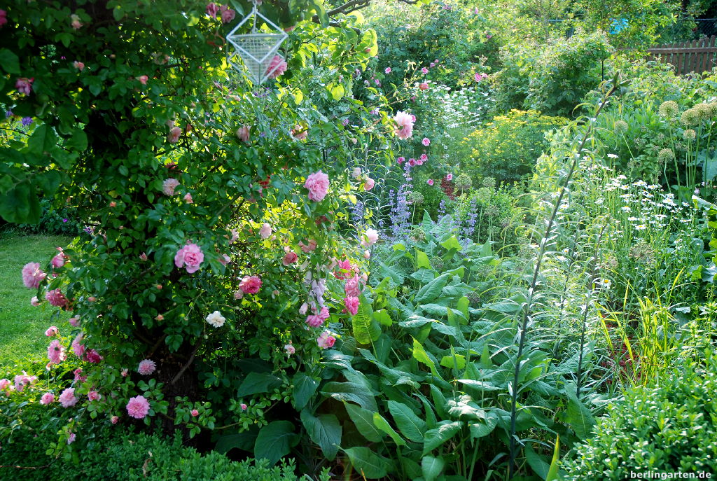 Im Moment ist alles üppig im Garten. Es kommt nicht darauf an, hier und da etwas mehr für einen tollen Blumenstrauß zu schneiden. Ich muss sogar an vielen Stellen aktiv ran, weil wir sonst bei den schmalen Gängen gar nicht mehr durchkämen. Oft genug zeigen Kratzer an Armen und Beinen, dass wir Rosen haben („Nein, keine Katzen“, muss ich manchmal im Büro aufklären.)