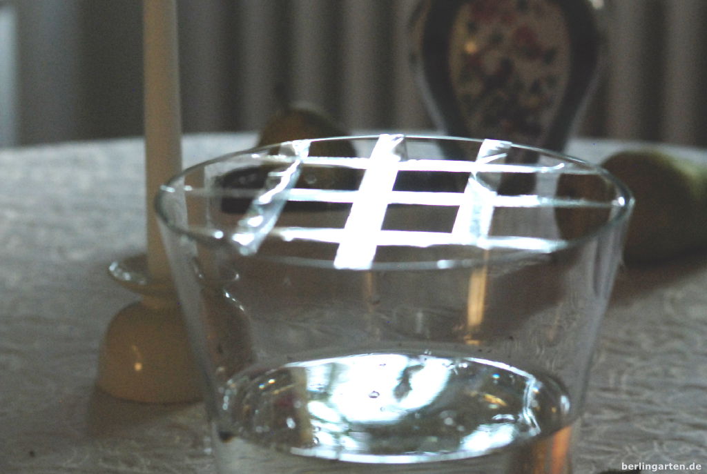 Da alle Stiele weich und wild gebogen sind, präpariere ich die weite Glasvase vor dem Arrangieren: Tesafilmstreifen kreuz und quer geklebt sorgen dafür, dass nicht alle Blumen sofort auf eine Seite kippen. Und gläserne Orchideen-Stäbe helfen, die bei den nostalgischen Rosen manchmal schweren Köpfe zu stützen. Da hier an Blüten und Blättern so viel los ist, fallen diese Helfer gar nicht weiter auf. Alles schick, oder?