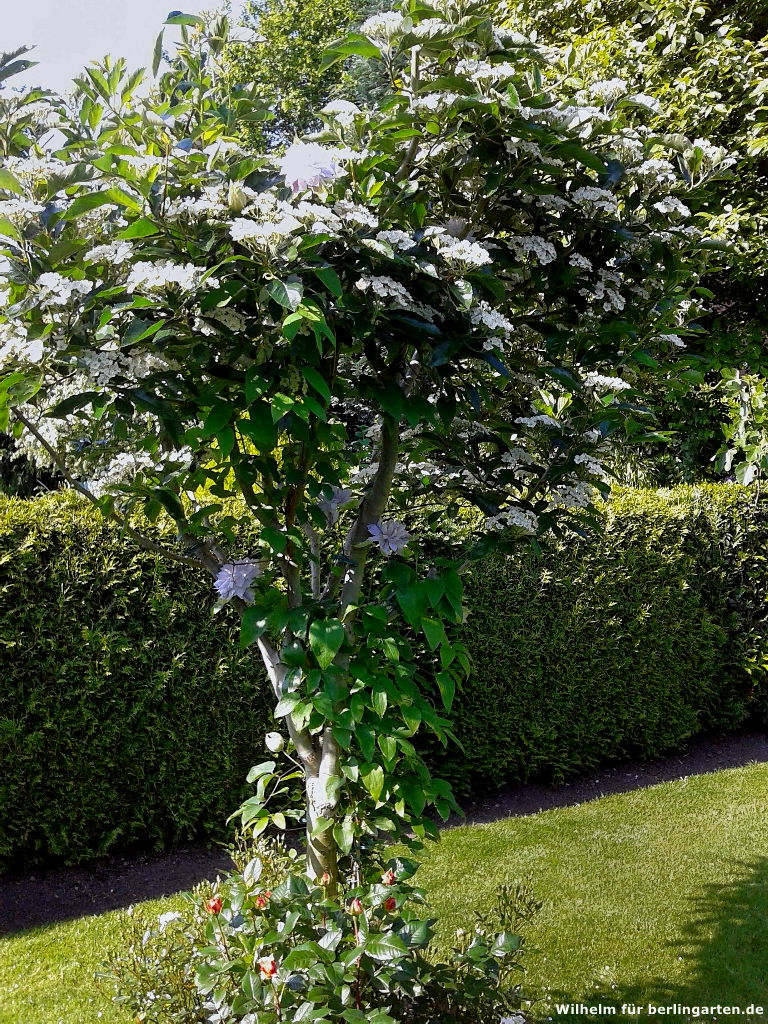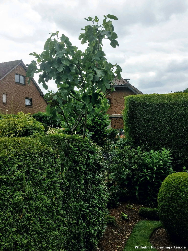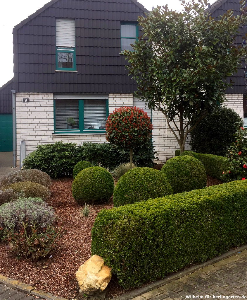 Das würde ich so nicht sagen: Der Vorgarten ist formal und überwiegend mit immergrünen Gehölzen und ohne Rasenfläche gestaltet! Eine Besonderheit für unsere Klimazone ist die immergrüne Magnolie (Magnolia grandiflora). Sie hat sich prächtig entwickelt und mit den hiesigen Wetterbedingungen arrangiert. Den Bienen bieten wir unter anderem Nahrung durch unsere Obstbäume – wenn im Frühjahr der Apfelbaum, der Pfirsich sowie vor allem der Zierapfel Malus ‚Scarlet‘ blühen, ist bei uns tüchtig was los.