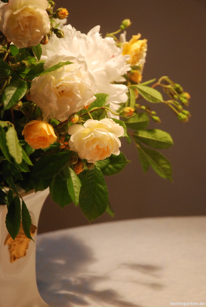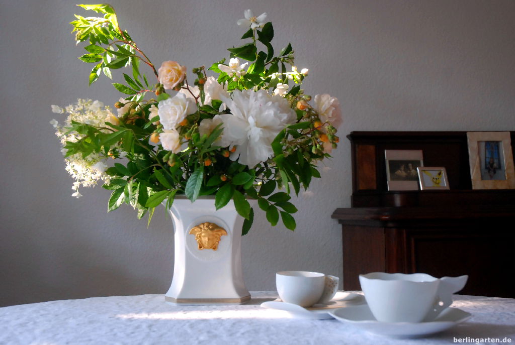 Als jetzt die ersten Rosen erblühten, dachte ich sofort an meine unterkühlte Schöne aus Porzellan. Und wie findest du nun meinen Strauß aus Rose (Ghislaine de Feligonde), Pfingstrose (Paeonia Festiva Maxima), Bauernjasmin (Philadelphus coronarius) und Kletterhortensie (Hydrangea petionalis)? Die Blüten allesamt in weiß, die Rose in interessantem Farbspiel von gelb im Knospenstadium hin zu cremeweiß im aufgeblühten Zustand?