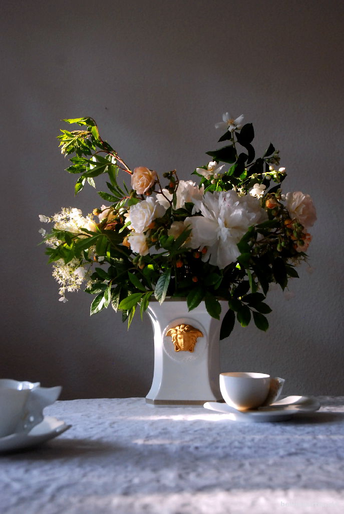 - Vase Versace Gorgona von Rosenthal mitStrauß mit Rosen, Pfingstrosen und Jasmin