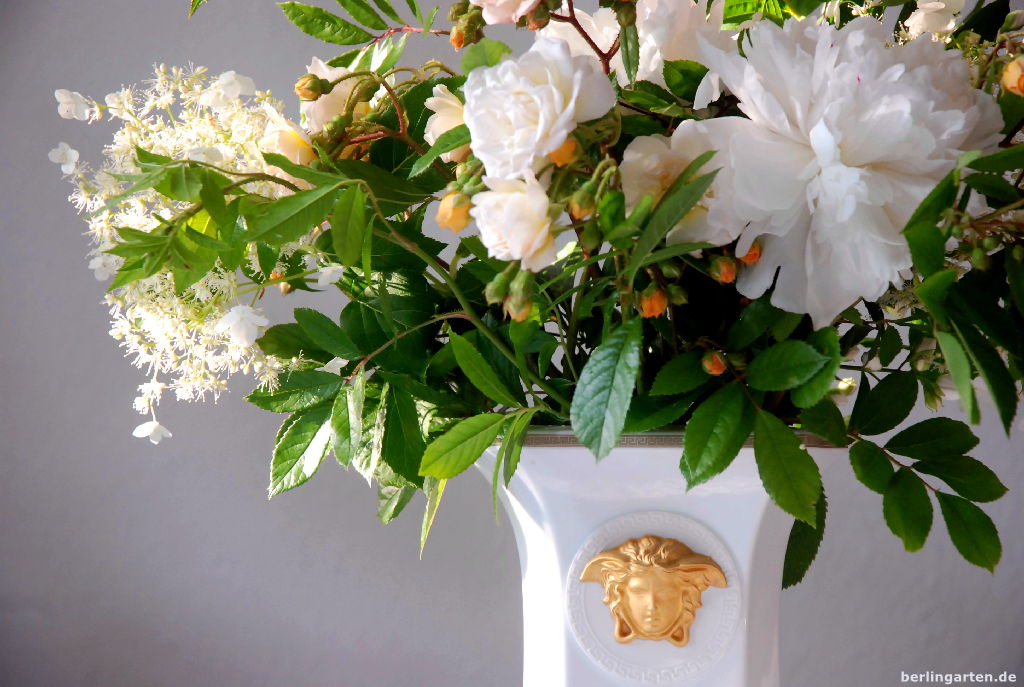 Als ich sie dann aber mein Eigen nennen konnte, merkte ich: Das gute Stück ist schwierig. 18 cm hoch, trotz der Taillierung etwas steif und vor allem in der Farbkombination weiß-gold zu wenigen Sträußen passend. Vielleicht ginge es mit roten Rosen? Als ich wunderschöne von meinem Liebsten geschenkt bekam, stellten sich die geraden, ebenfalls staksigen Blumen als irgendwie gezwungen in diesem Traum von Versace heraus. Und so kam ich zu der Erkenntnis: Solch eine Vasenform braucht ungestüme Partner mit wilder Wuchsform, dann kann sie in ihrer Klarheit den nötigen Konterpart geben.