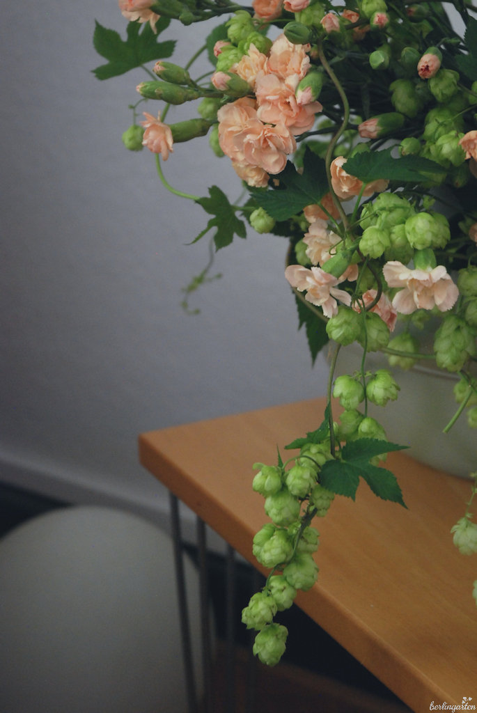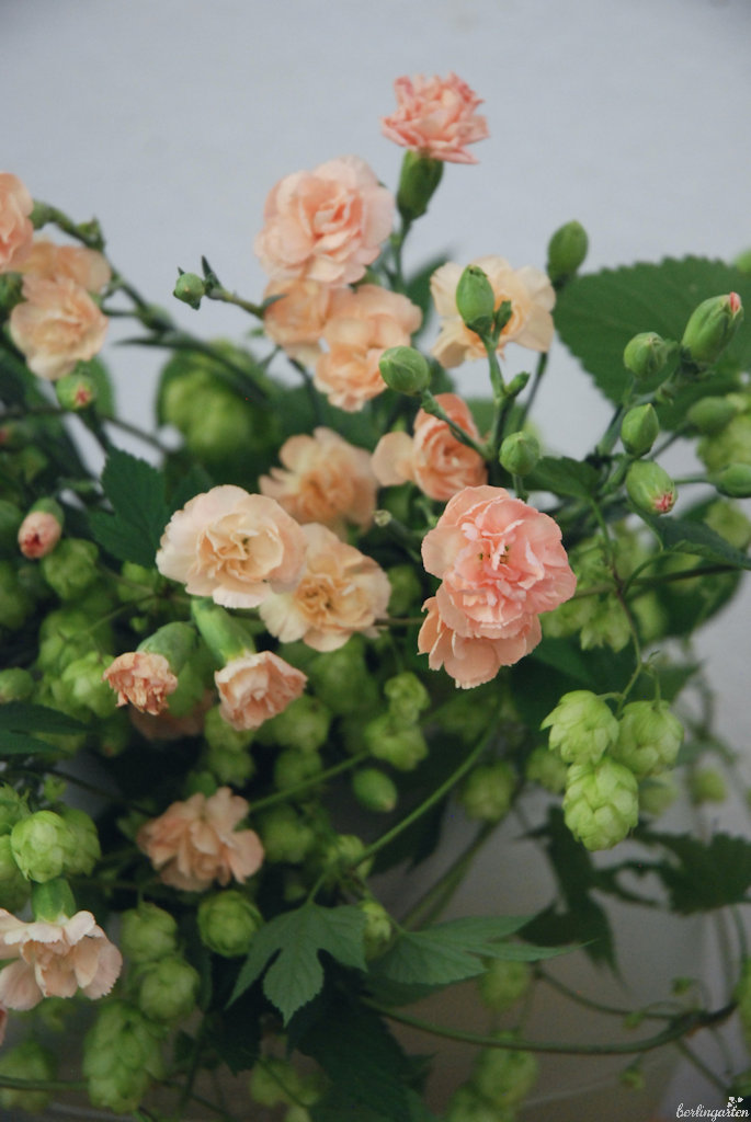 Nun fiel aber mein Blick auf den Hopfen, der sich derzeit aller Zäune bemächtigt. Das war es: „Lush“ müsste der Strauß sein, der schön zu meiner Ballonvase aussehen würde. Üppig, locker, wild umspielend. Also ran an den Hopfen, ein paar Lianen würde er schon entbehren können. Zum hellen Grün der Hopfenfrüchte (die übrigens nur die weiblichen Pflanzen ausbilden) brauchte ich darüber hinaus gar nicht mehr viel. Die zart apricotfarbenen Nelken, die durch ihren etwas steifen Wuchs auch nicht ganz einfach zu stylen sind, fand ich genau richtig.
