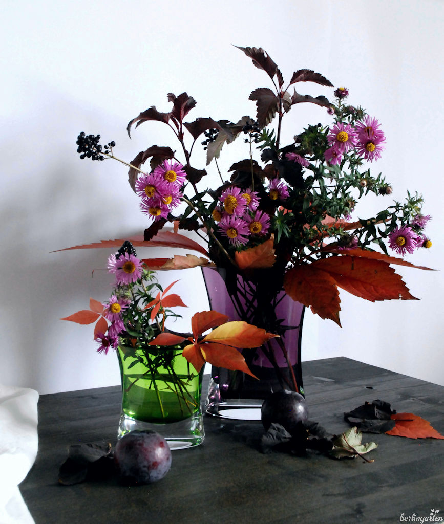 Als Ergänzung zu den Astern setze ich ganz auf rot-violett. Das ist ein Tipp der Topfloristinnen, die gern mal auf das klassische Grün verzichten. In der Vase vereinen sich Perückenstrauch, Ligusterbeeren und Wilder Wein mit den Blüten der rosa Astern. Es entsteht, arrangiert in zwei Vasen, trotz der simplen Zutaten ein ungewöhnliches Bild.
