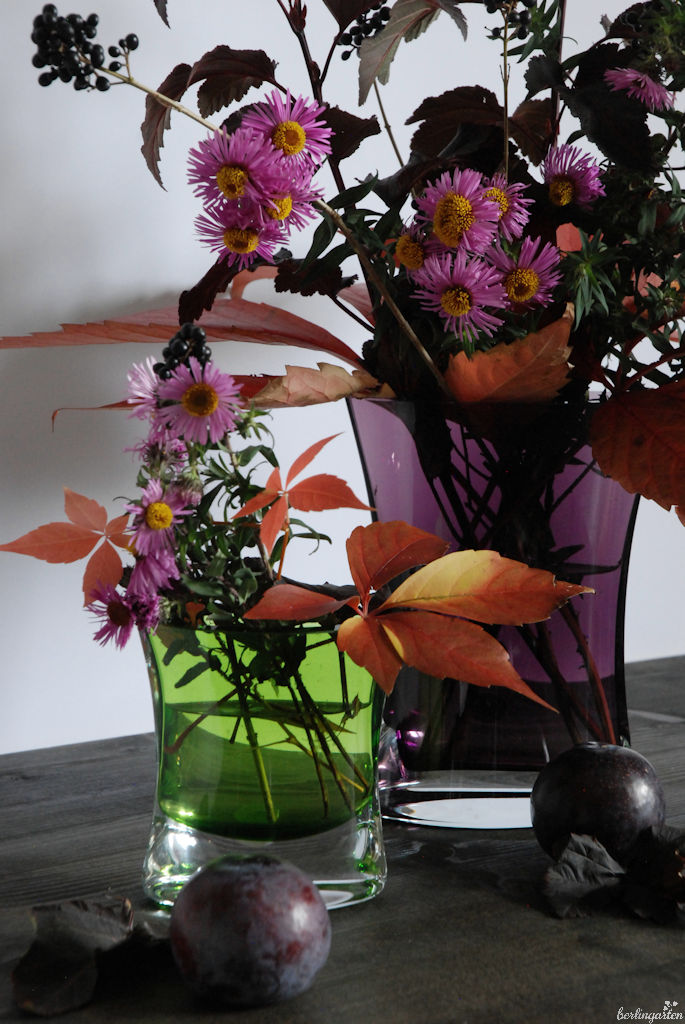 Mehrere Vasen finde ich praktisch und von der Wirkung her super. Da ich Amateurin bin, erziele ich oft einen besseren Look, indem ich meine Blumen auf zwei Gefäße verteile. Wenn man hauptsächlich Material aus dem Garten verwendet, sind die Stiele auch oft unterschiedlich lang – wie hier bei meinen Astern, von denen ich Wurzelstücke neu aufgepflanzt und daher die Blüten zur Entlastung der Stauden abgeschnitten habe.