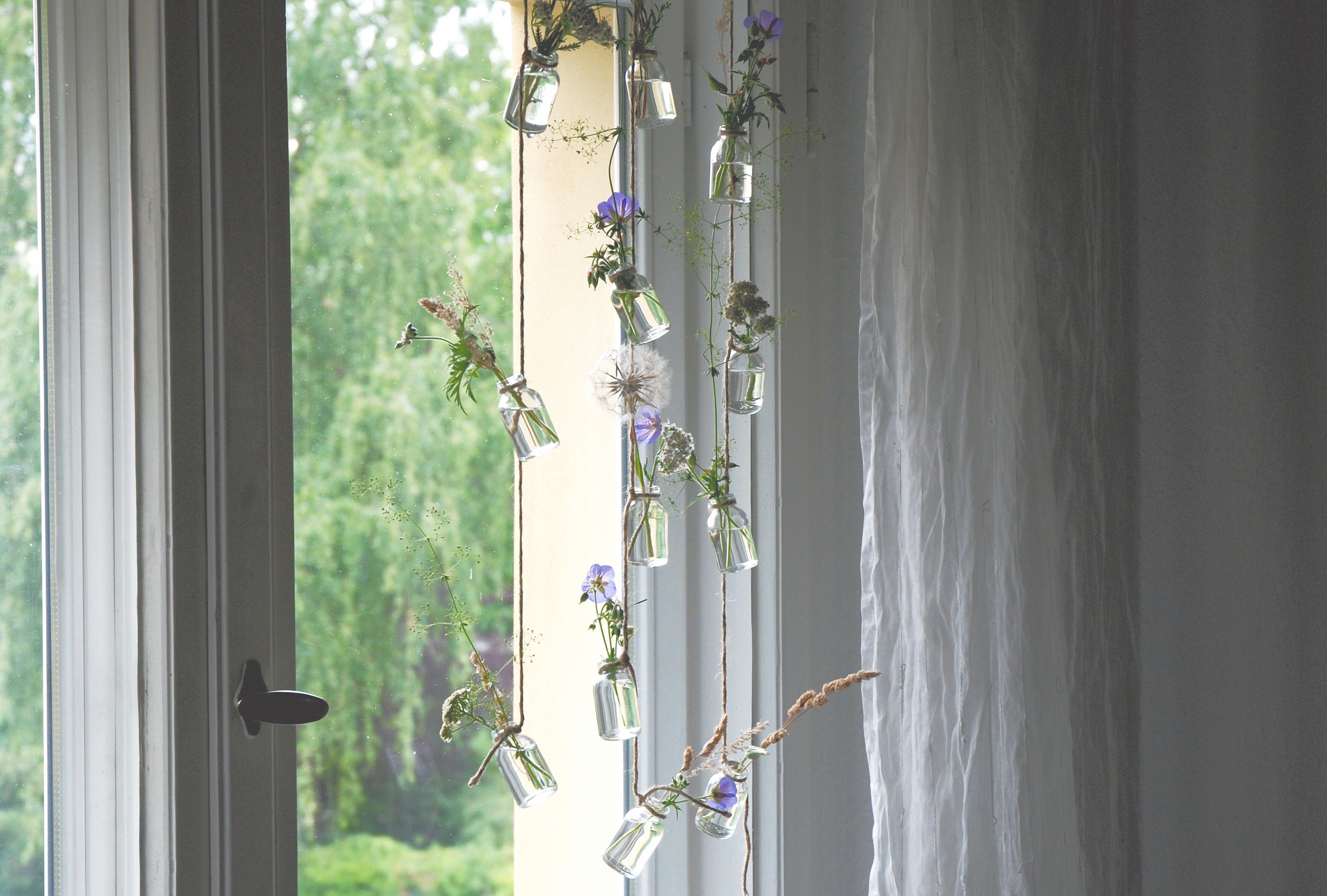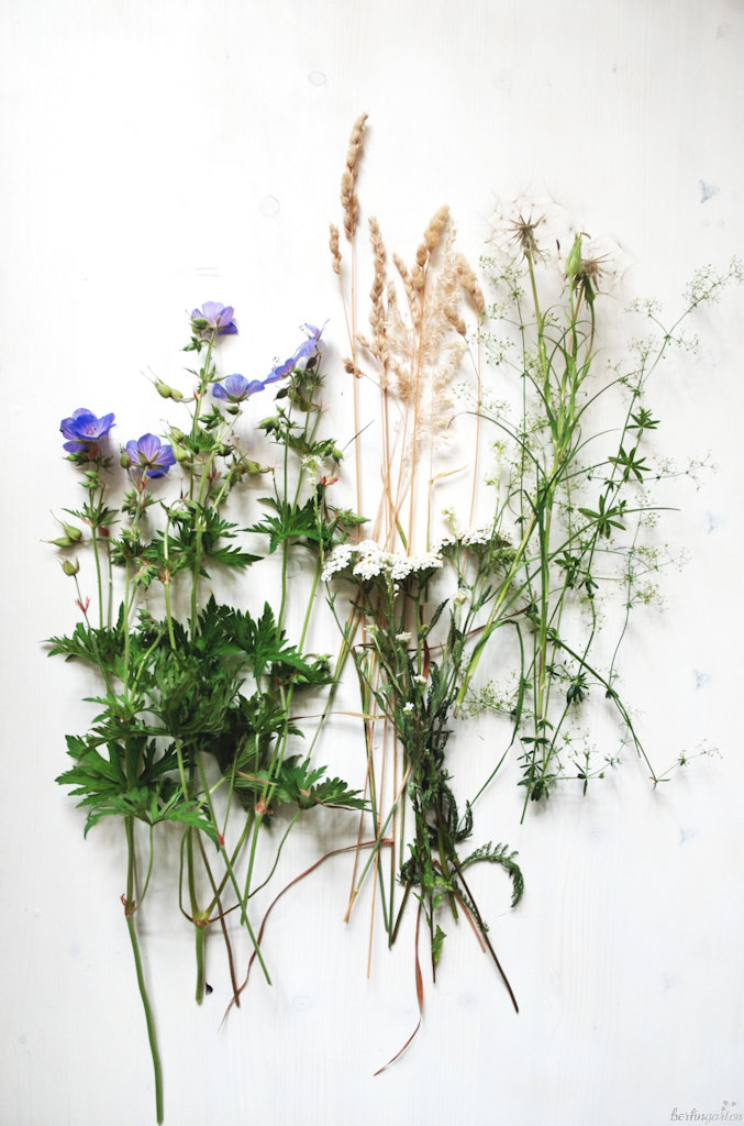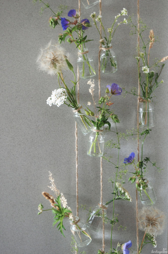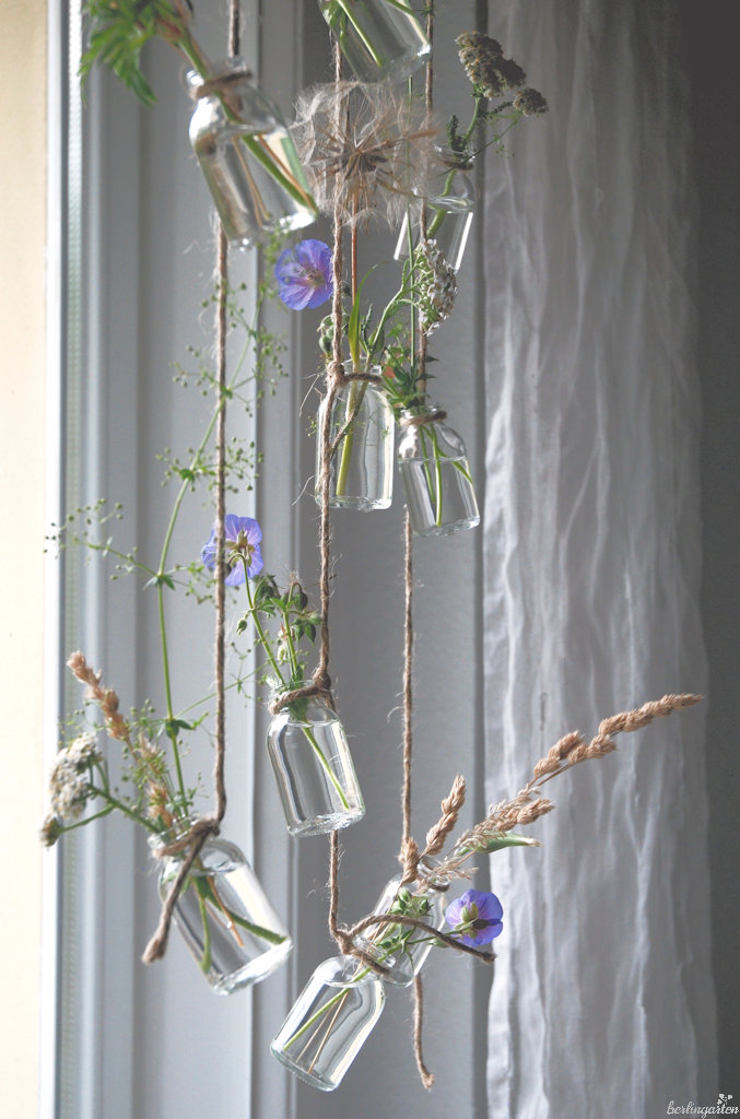 Meine Mischung aus Storchschnabel, Schafgarbe, Gräsern und Samenständen fand ich für einen traditionellen Vasenstrauß zu unterschiedlich. Auch hatte ich nicht wirklich viele Blumen mitgenommen, schließlich soll sich die Wiese durch Versamung selbst in ihrer Vielfalt erhalten. Also nutzte ich drei Hanfschnüre, an die ich jeweils fünf Glasfläschchen geknotet hatte. Die Zutaten dazu hatte ich mir von meiner Hollandreise mitgebracht. Mit S-Haken in der Küche zunächst aufgehängt, war das Befüllen ein Kinderspiel. Anschließend zogen die drei „Wiesenblumen-Stränge“ an ein Wohnzimmerfenster mit Gardinenstange um.