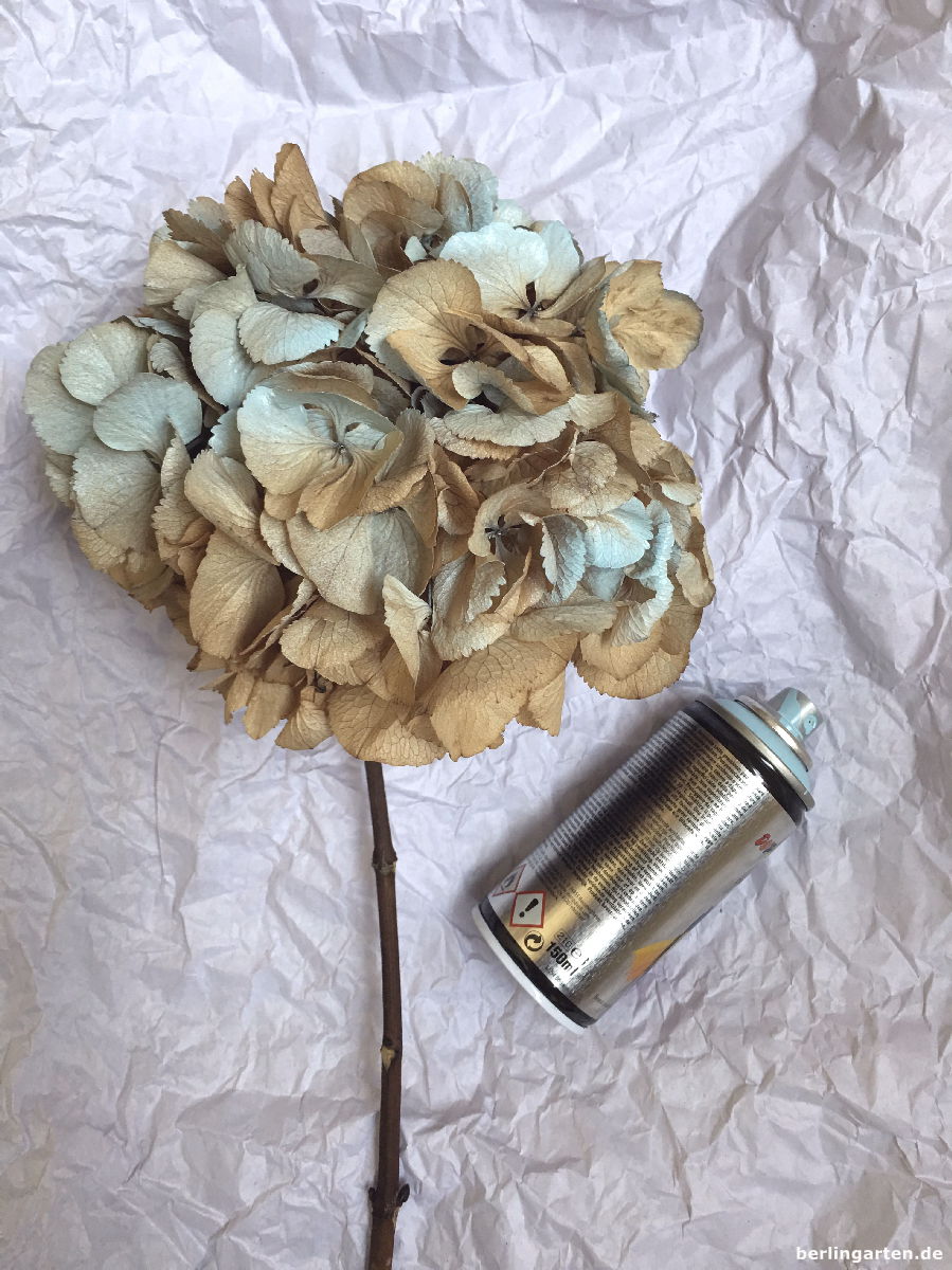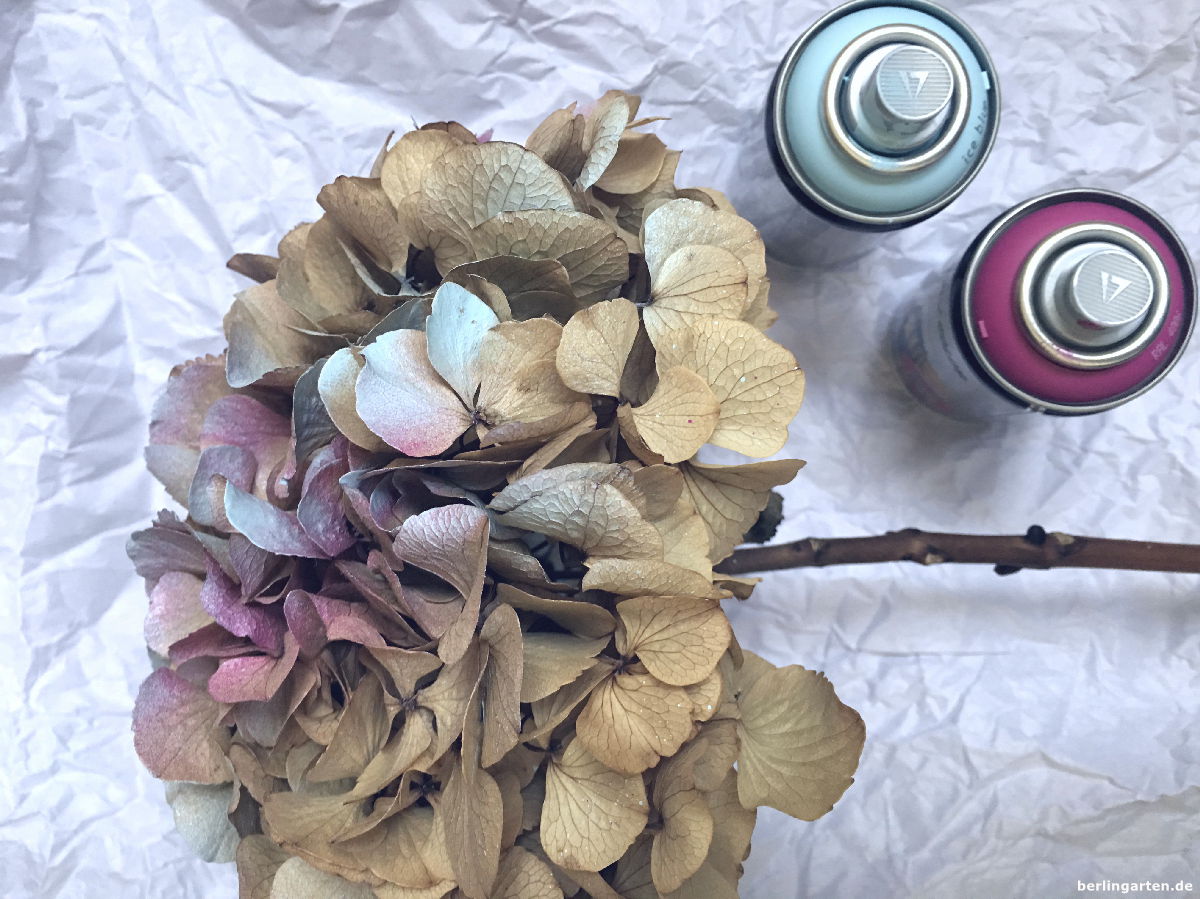 Ich mag es ja eigentlich mehr natürlich… aber ich muss sagen, das Ergebnis ist toll geworden! Wäre ja nie auf die Idee gekommen, Hortensien mit Farbe anzusprühen!