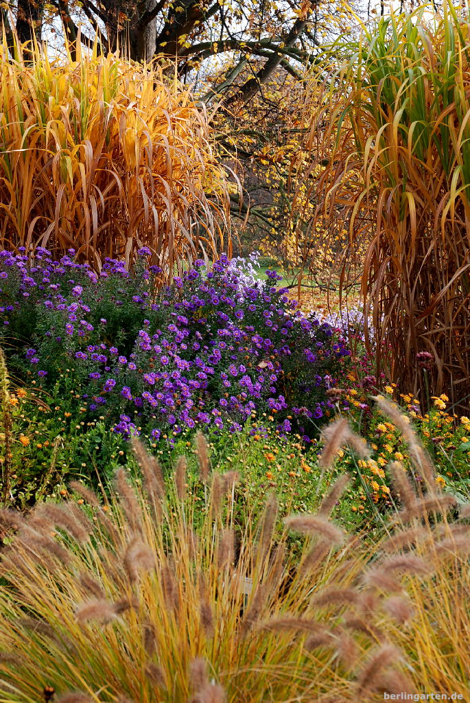 Besonders schön finde ich die Kombination der klassischen Sorten mit Gräsern und Astern. Zusammen können sie sich auch an Tagen stützen, an denen Tau und Regen die Blütenköpfe schwer werden lassen. Als halbhohe Stauden gehören Chrysanthemen ins Beet-Mittelfeld, von wo aus sie unser Herz im Sturm und ohne viel Konkurrenz erobern können. Da sie dazu neigen, über das Jahr von unten zu verkahlen, sind niedrige Gräser wie Carex oder das Japangras kaschierende Lösungen zu ihren Füßen. Schön stelle ich mir auch die Polster-Glockenblume (Campanula poscharskyana) vor, der es ebenfalls völlig egal ist, dass sich das Gartenjahr langsam dem Ende zuneigt. Gemeinsam geben diese späten Stauden den Staffelstab dann an die frühen Christrosen ab, aber das ist eine neue Kolumne.