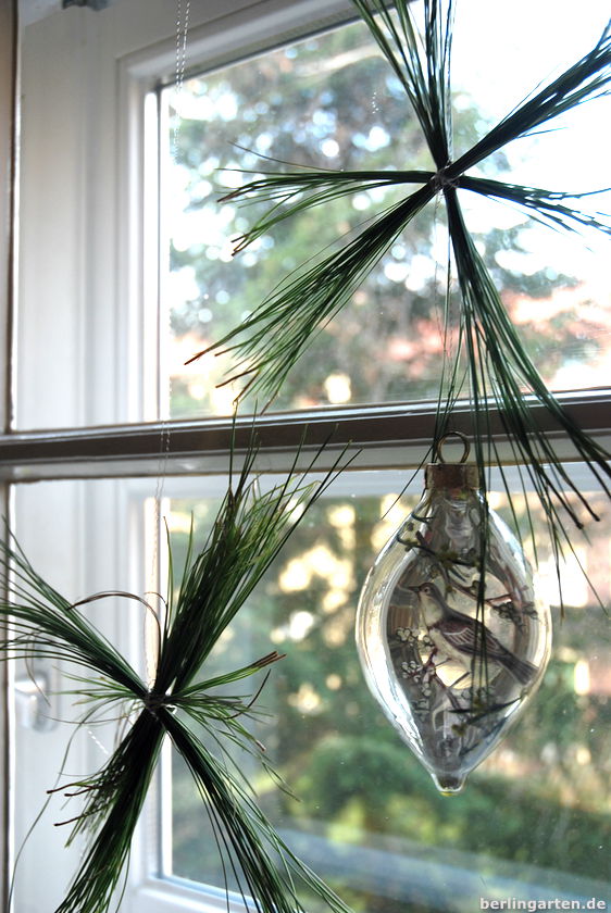 Also habe ich eine handvoll mitgebracht, bis jetzt in der Vase aufbewahrt, zu Sternen gedreht und meiner Amaryllis als Dekoration beigegeben. Eine schnelle Naturdeko ganz im Sinne von berlingarten. Und weil’s so schön und simpel ist, habe ich auch gleich welche ans Fenster gehängt.