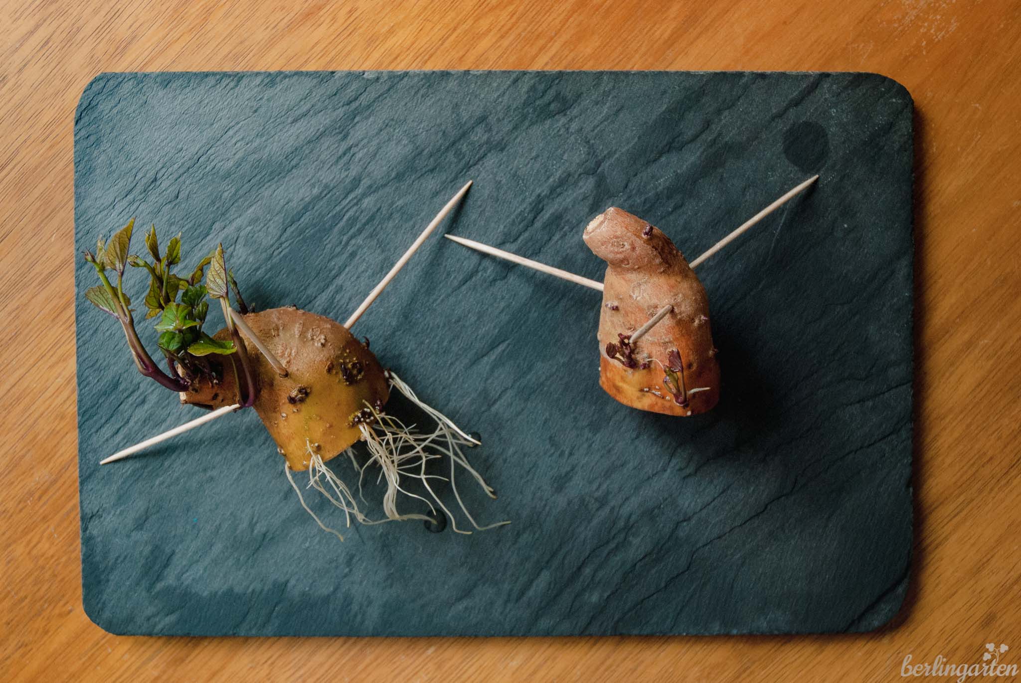 Wenn du es mit gekauften Süßkartoffeln probieren möchtest, rate ich zu Bioware, da ich generell bevorzuge, in unserem „Biotop Garten“ nur Bio zu verwenden, außerdem können wir dann darauf hoffen, dass keine Wachstumshemmer verwendet wurden.