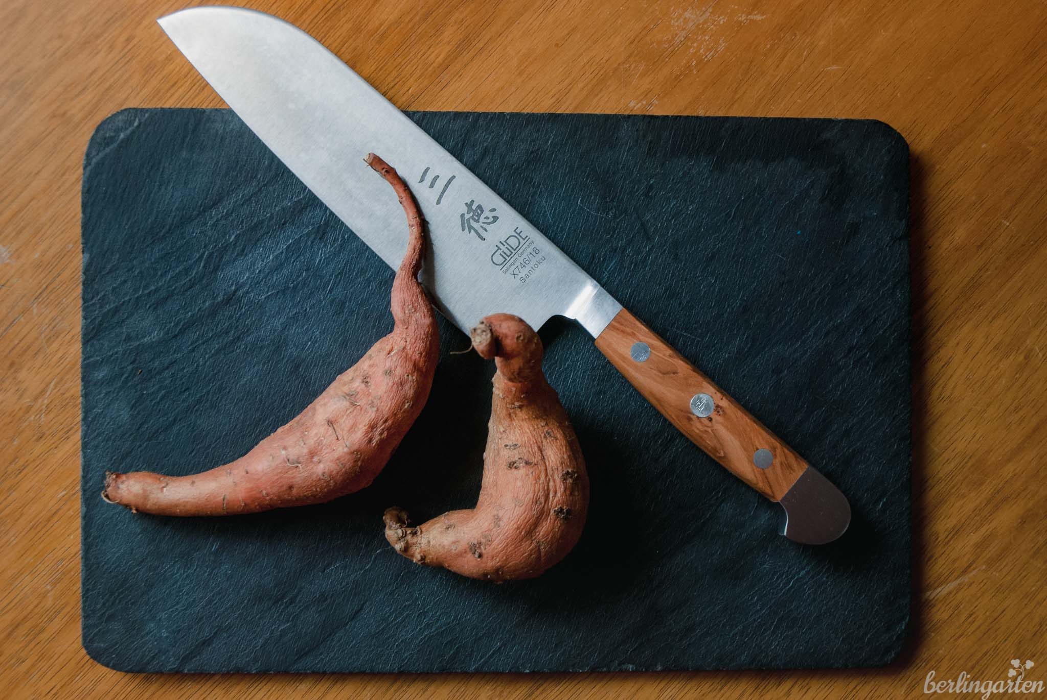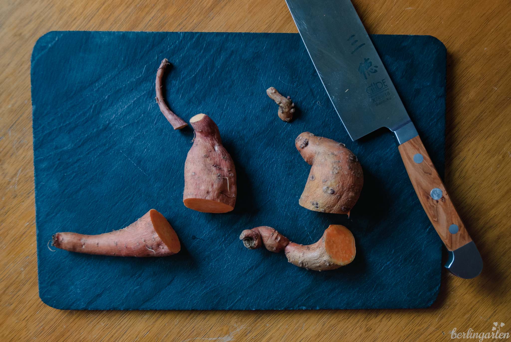 Ich habe ein „Curing nach Hausfrauenart“ durchgeführt: Die Süßkartoffeln werden angefeuchtet, in eine dunkle Plastiktüte gesteckt und an die Heizung gehängt. Eine Woche lang habe ich dann regelmäßig geprüft, dass nichts anfängt zu faulen und wieder ein wenig Wasser nachgesprüht. Anschließend konnte ich die Süßkartoffeln ganz normal in unserer Speisekammer lagern. Alt geworden sind die Knollen sowieso nicht, dafür sind sie ja viel zu lecker. Nur die zwei Kleinen habe ich aufbewahrt, die Gründerinnen meiner diesjährigen Süßkartoffel-Familie.