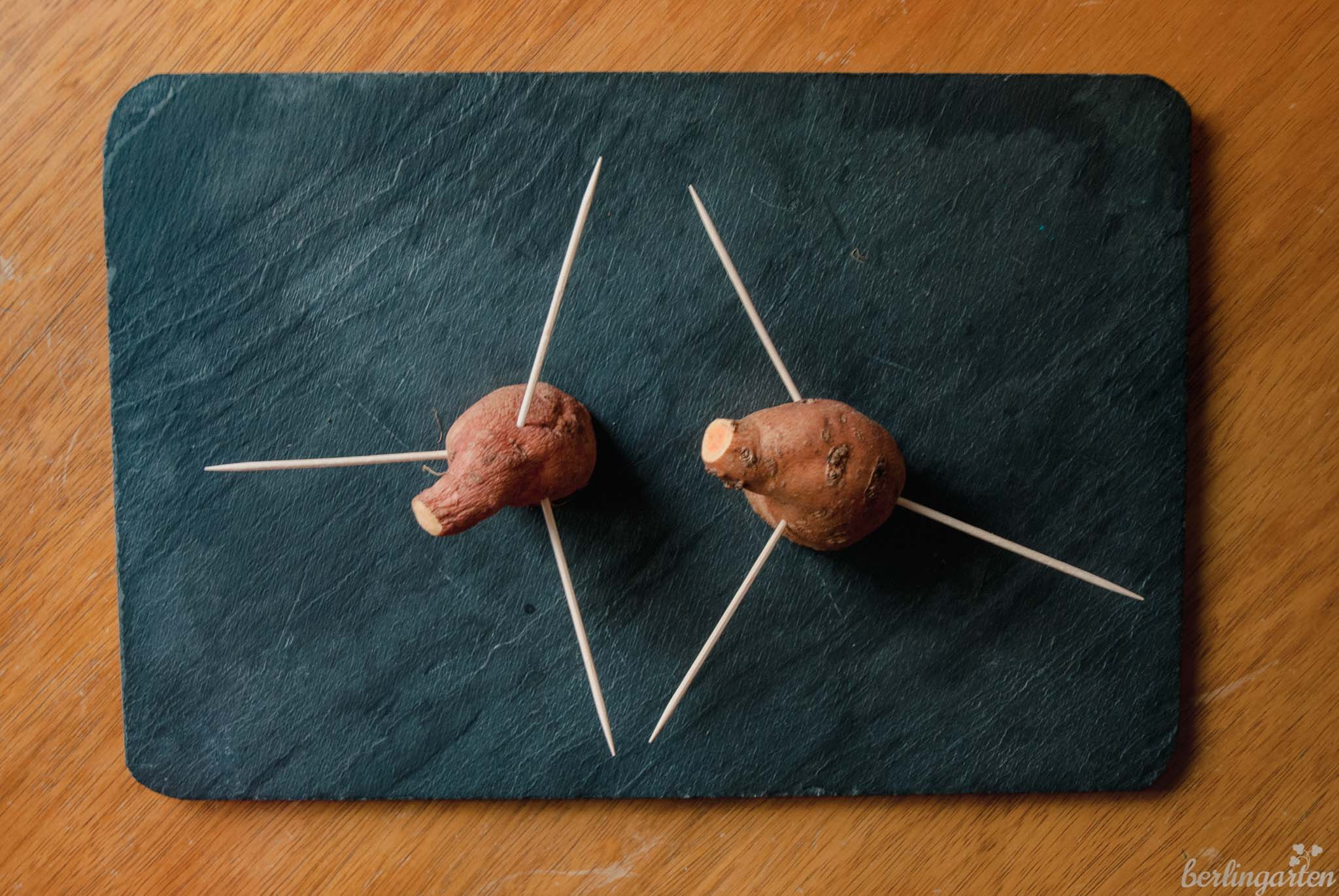 Ich habe es jedoch mit dem Antreiben in Wasser versucht und dazu zwei kleine Restkartoffeln aus meiner Vorjahresernte verwendet. Das Vortreiben ging sehr gut und richtig schnell. Ich habe die Knolle quer halbiert, mit Zahnstochern versehen und sie rund 2 cm tief in ein Töpfchen mit Wasser gehängt. Bereits nach einer Woche gab es Wurzelansätze.