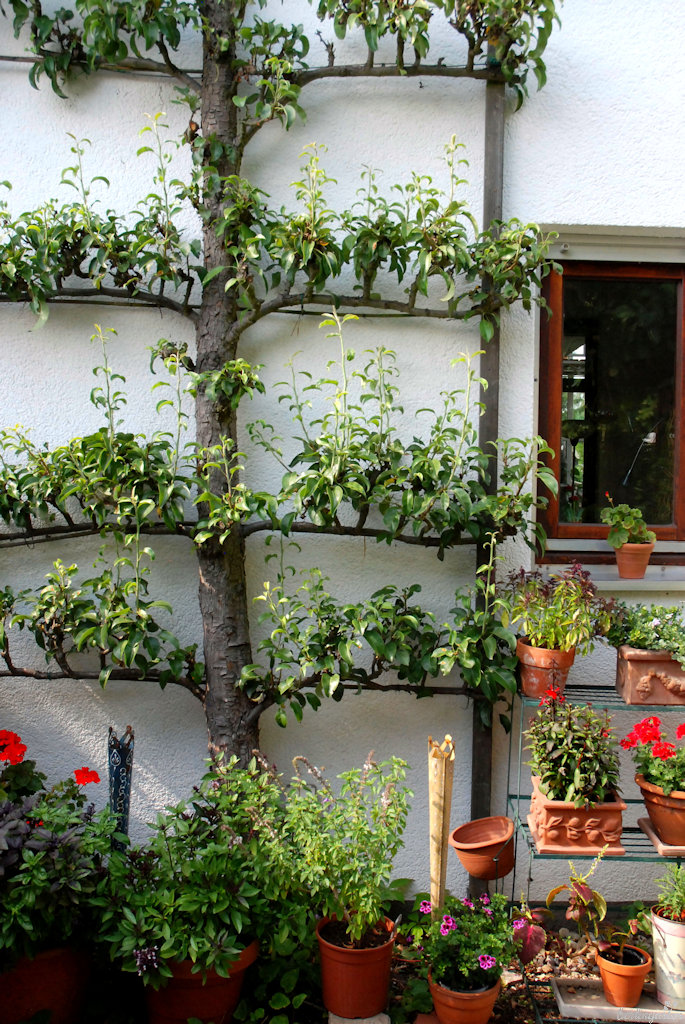 Theos Domizil ist rund ums Jahr eine Wohlfühloase, es blüht im Garten, auf der Dachterrasse und im Wintergarten. Auf mich wirkte es nach leidenschaftlichem Gärtnern auf jedem Zentimeter. Und wo der Platz in der Fläche ausgenutzt ist, kommt die Vertikale hinzu – durch Kletterpflanzen das Haus hinauf sowie Spalierobst. Bei Theo wächst in den unterschiedlichen Gartenbereichen eine Mischung aus bunten Stauden, Einjährigen und Gehölzen. Wasser plätschert am Teich und etwas Frisches für den Teller sowie viele Kräuter soll der Garten auch noch hergeben. An Obst gibt es verschiedene Beeren, Birnen, Quitten und Kirschen. Mediterranes Flair entsteht durch viele entsprechende Pflanzen in hübschen Töpfen und Kübeln, die im Wintergarten überwintert werden. So eine Fülle und Freude auf noch nicht einmal 200 Quadratmetern – da sage noch einer, ein kleiner Garten sei für irgendetwas zu klein…